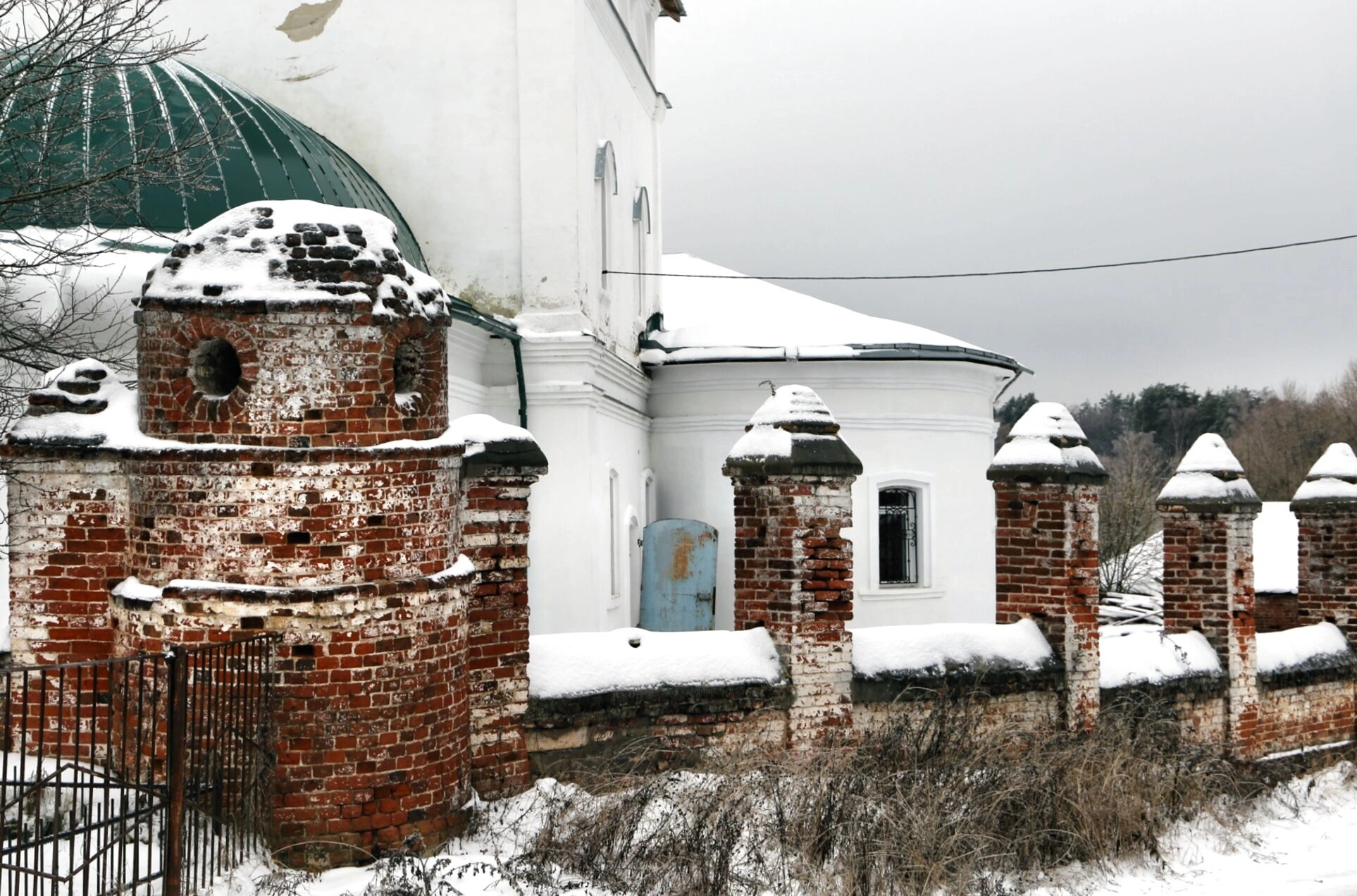На переднем плане фотографии видна кирпичная ограда храмовой территории с полуразрушенными столбами и ажурными металлическими воротами. Ограда демонстрирует следы времени, напоминая о долгой истории этого духовного места. Зимний пейзаж с деревьями, лишёнными листвы, и снежным покровом, укутавшим землю, крыши и ограду, создаёт атмосферу умиротворённости и покоя, характерную для сельских храмов России.