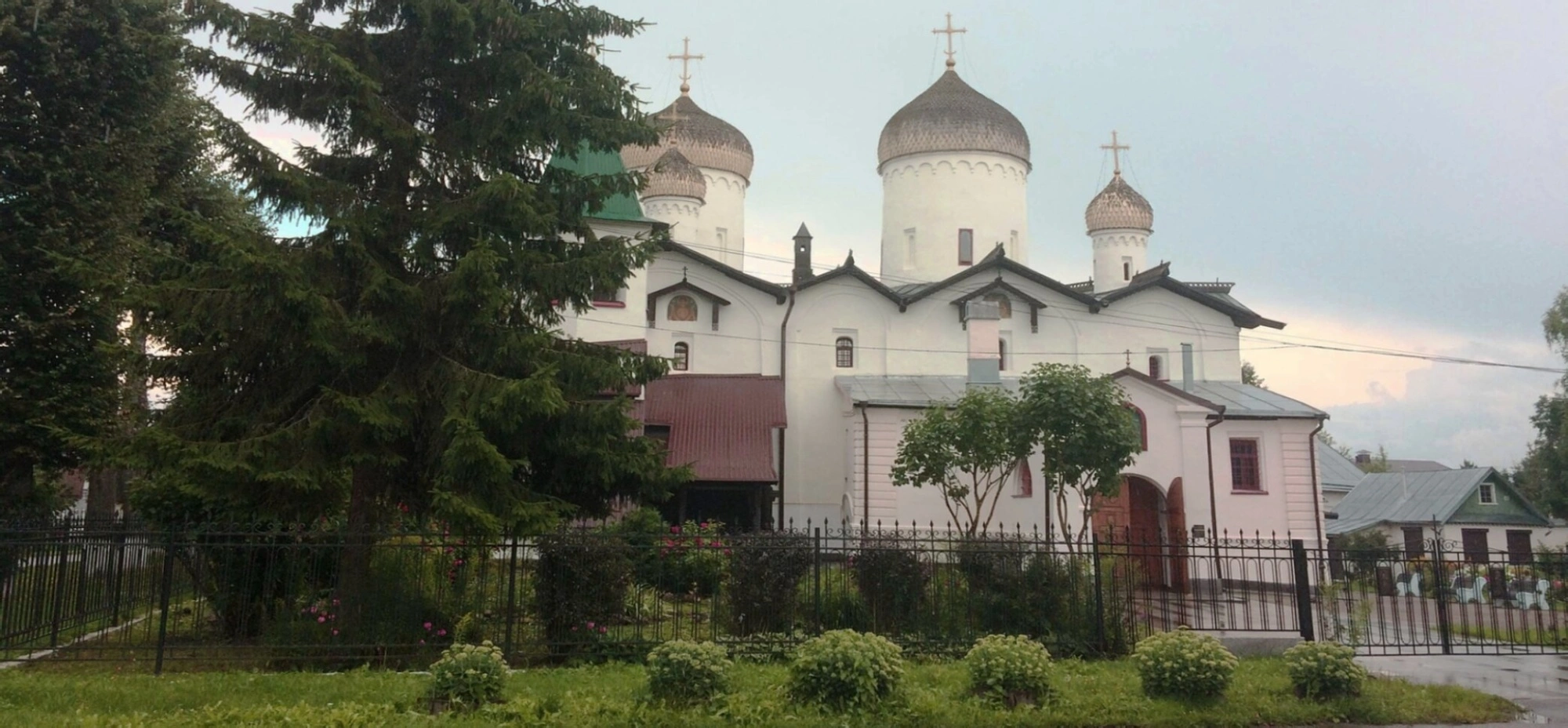 Белокаменные стены храма, увенчанные традиционным пятиглавием, и стройная шатровая колокольня создают гармоничный и величественный архитектурный образ, характерный для периода расцвета новгородского храмостроительства. Здание органично вписано в окружающий природный ландшафт: его окружают высокие деревья, под сенью которых находится эта святая обитель, а также видна часть каменной ограды, отделяющей мирскую суету от места молитвенного уединения.