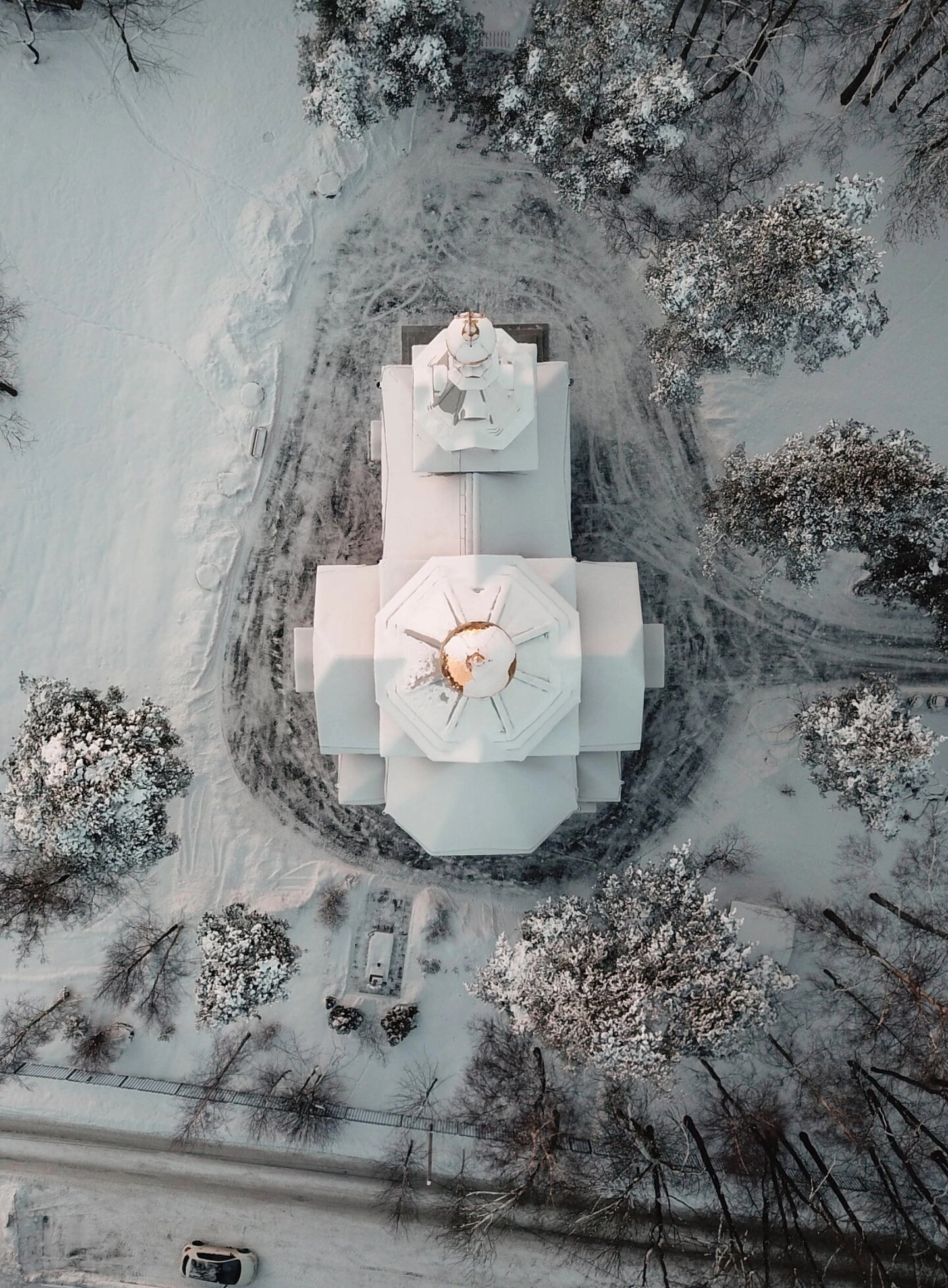 На представленной фотографии запечатлена церковь Святого Апостола Петра, расположенная в историческом районе Лахта города Санкт-Петербурга. Снимок выполнен с высоты птичьего полета в зимний период, когда храм и окружающая его территория покрыты пушистым снежным покровом. Архитектурный ансамбль церкви представляет собой прекрасный образец современного православного зодчества.