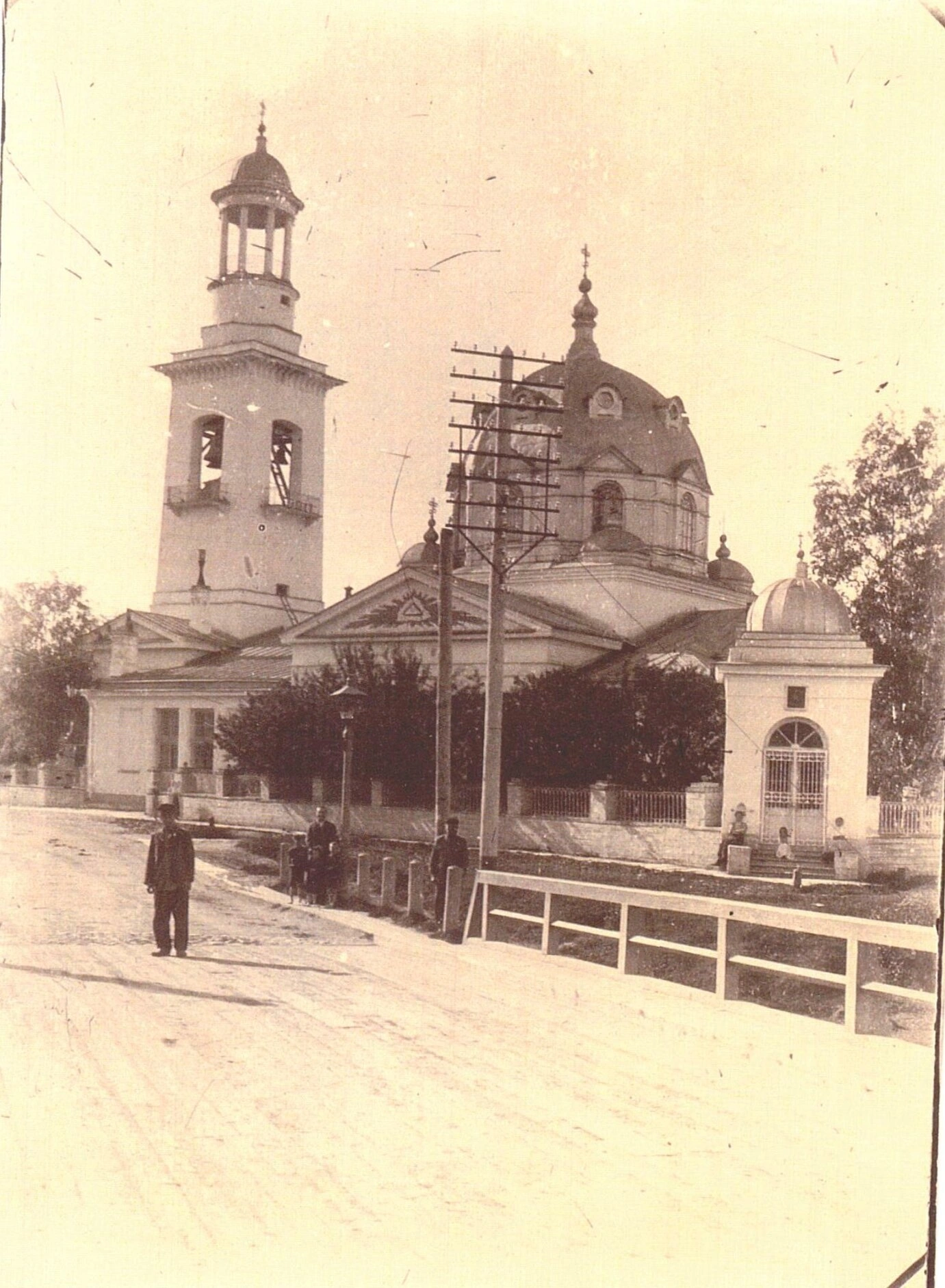На переднем плане фотографии видна прихрамовая территория, окруженная оградой, и небольшая сторожка или часовня. Примечательно наличие фигур людей, что позволяет оценить масштаб сооружения и погружает в атмосферу того времени. Присутствие столбов с проводами указывает на уже появившиеся к началу XX века технические достижения.