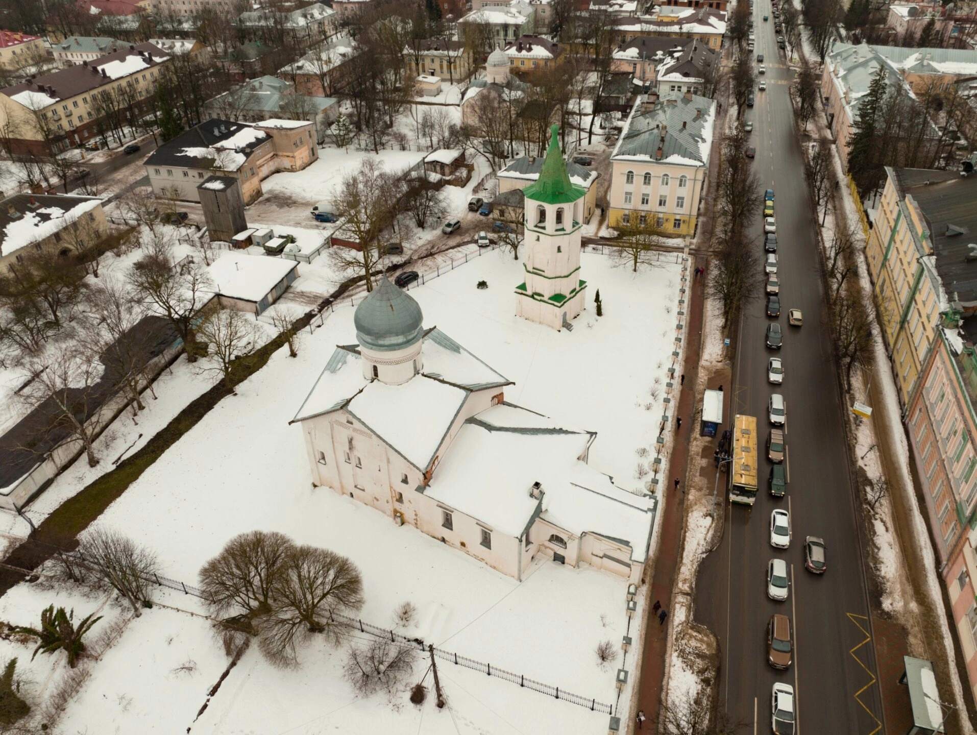 На представленной фотографии запечатлён зимний вид Церкви Святого Великомученика Дмитрия Солунского, что на Славкове улице в Великом Новгороде. Храм предстаёт в своём белоснежном убранстве, укутанный снегом, что придаёт ему особую благоговейную тишину и величие. Снимок сделан с высоты, открывая вид на главный купол-луковку, увенчанный крестом, и стройную шатровую колокольню, являющуюся архитектурной доминантой комплекса.