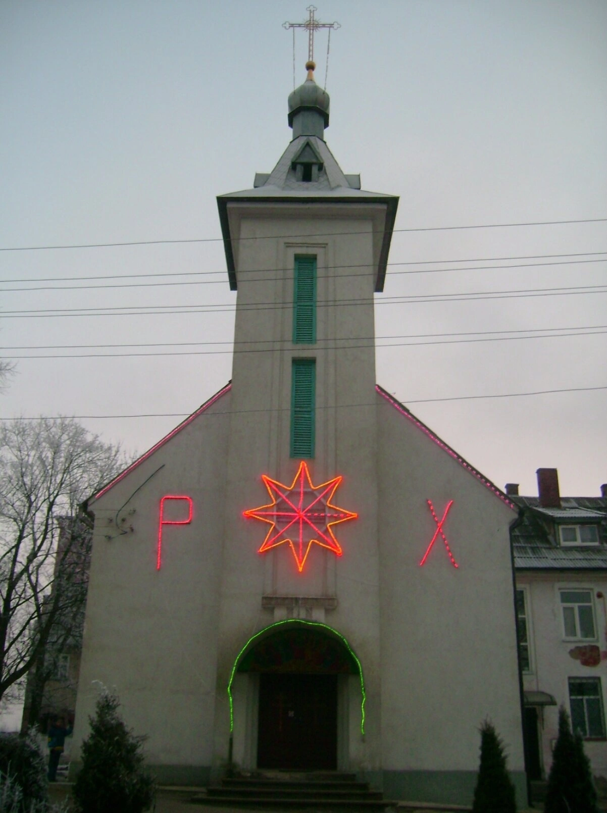 В тёмное время суток здание храма украшает благодатный свет неоновых вывесок. Чётко видна монограмма имени Спасителя нашего Иисуса Христа — хризма, состоящая из греческих букв «Хи» и «Ро», которые традиционно обозначают сокращение от слова «Христос». Также сияет звезда, символизирующая Вифлеемскую звезду, приведшую волхвов к месту Рождества Царя Идей.