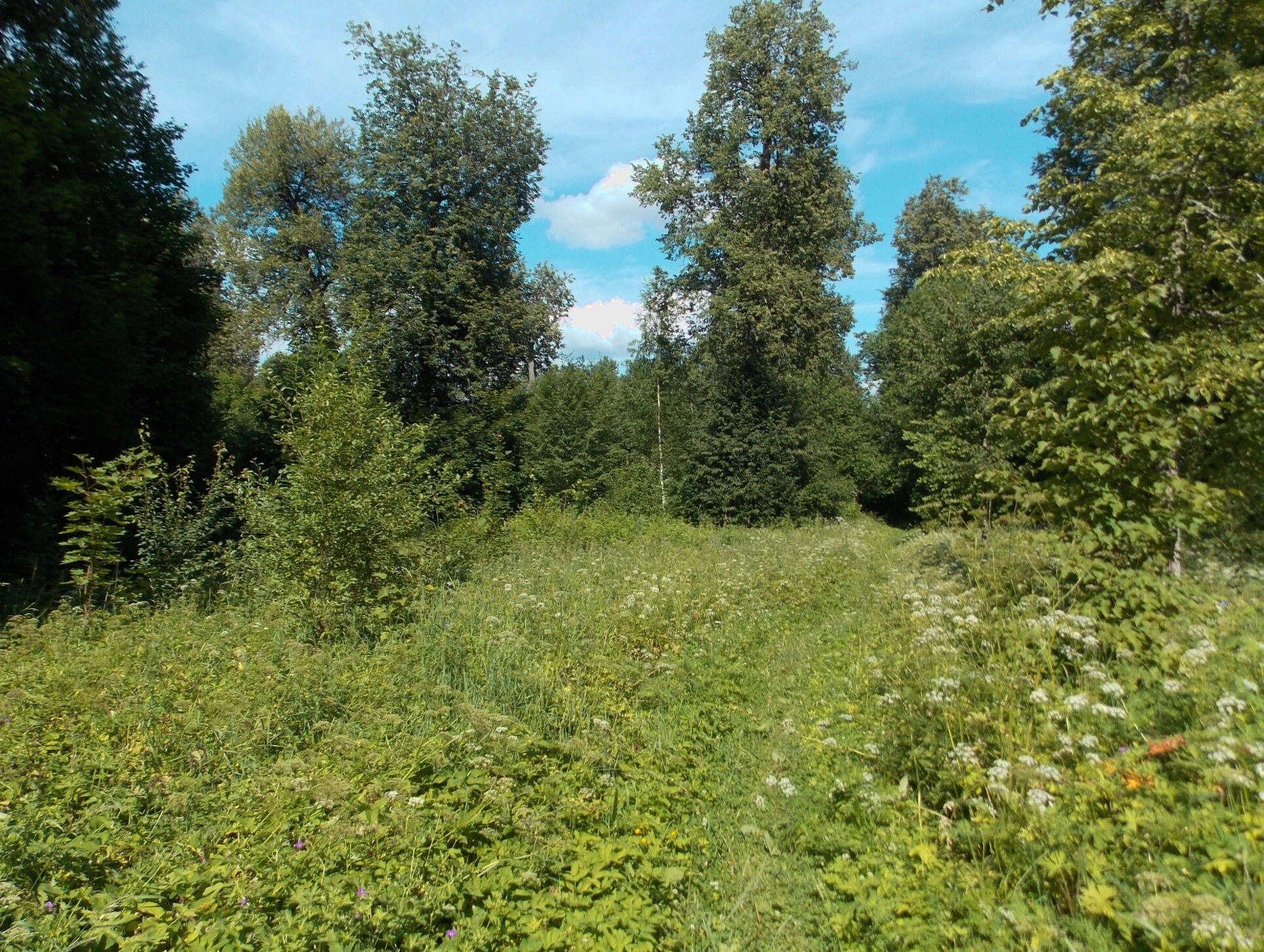 На переднем плане фотографии простирается поле, обильно поросшее луговыми травами и полевыми цветами, что создает ощущение естественной, нетронутой красоты. За густой растительностью возвышается стена смешанного леса, образуя природный кулисный фон для всего ансамбля. Небесный свод, частично покрытый облаками, мягко освещает ландшафт, придавая изображению спокойное, умиротворенное настроение.