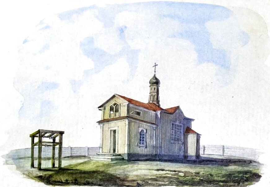 Архитектура храма характерна для белорусского церковного строительства того периода. Здание рублено из бруса, имеет крестово-купольную композицию, увенчанную массивным центральным куполом на восьмигранном барабане, который венчает святой крест. Рядом с основным объёмом храма возвышается шатровая колокольня, составляющая с церковью единый ансамбль. Отдельно на снимке видна деревянная сооружение, выполняющее, вероятно, функцию звонницы или навеса.