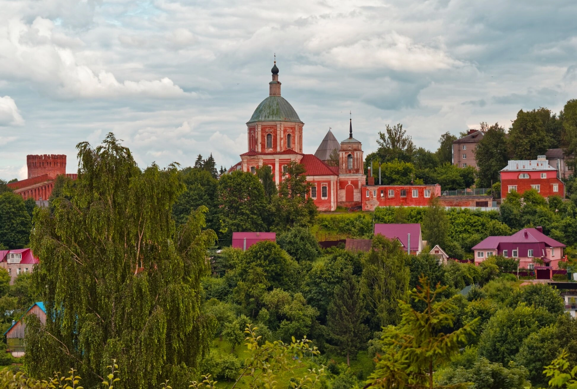 Обильная зелёная растительность, окружающая церковь, и крыши частных домов на переднем плане создают ощущение уюта и органичного единства природного, гражданского и сакрального пространств. Пасмурное небо с облаками добавляет снимку атмосферности и лирического настроения, напоминая о вечности и непреходящей красоте православных святынь.