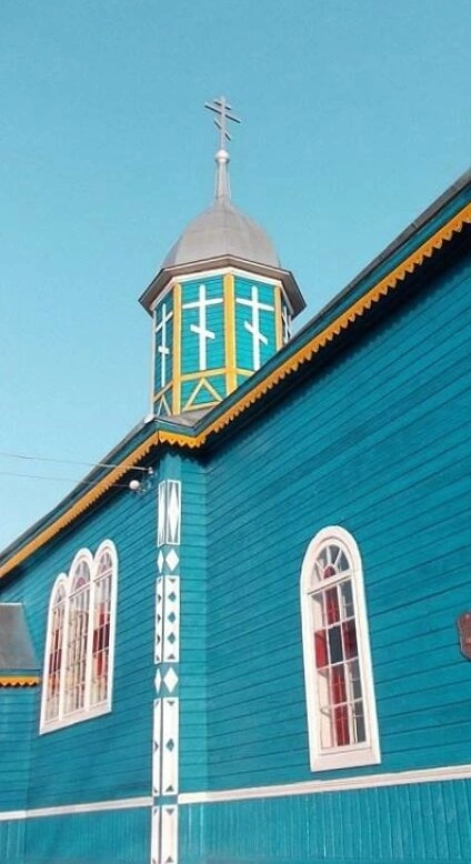 Фотография позволяет детально рассмотреть уникальный внешний облик святого места. Деревянный храм, окрашенный в благолепный синий цвет, символизирующий небесную чистоту и Богородицу, гармонично сочетается с ослепительно белыми декоративными элементами и обрамлениями арочных окон. Под свесом кровли чётко виден декоративный пояс, выполненный в жёлтых тонах, что добавляет сооружению торжественности и света.