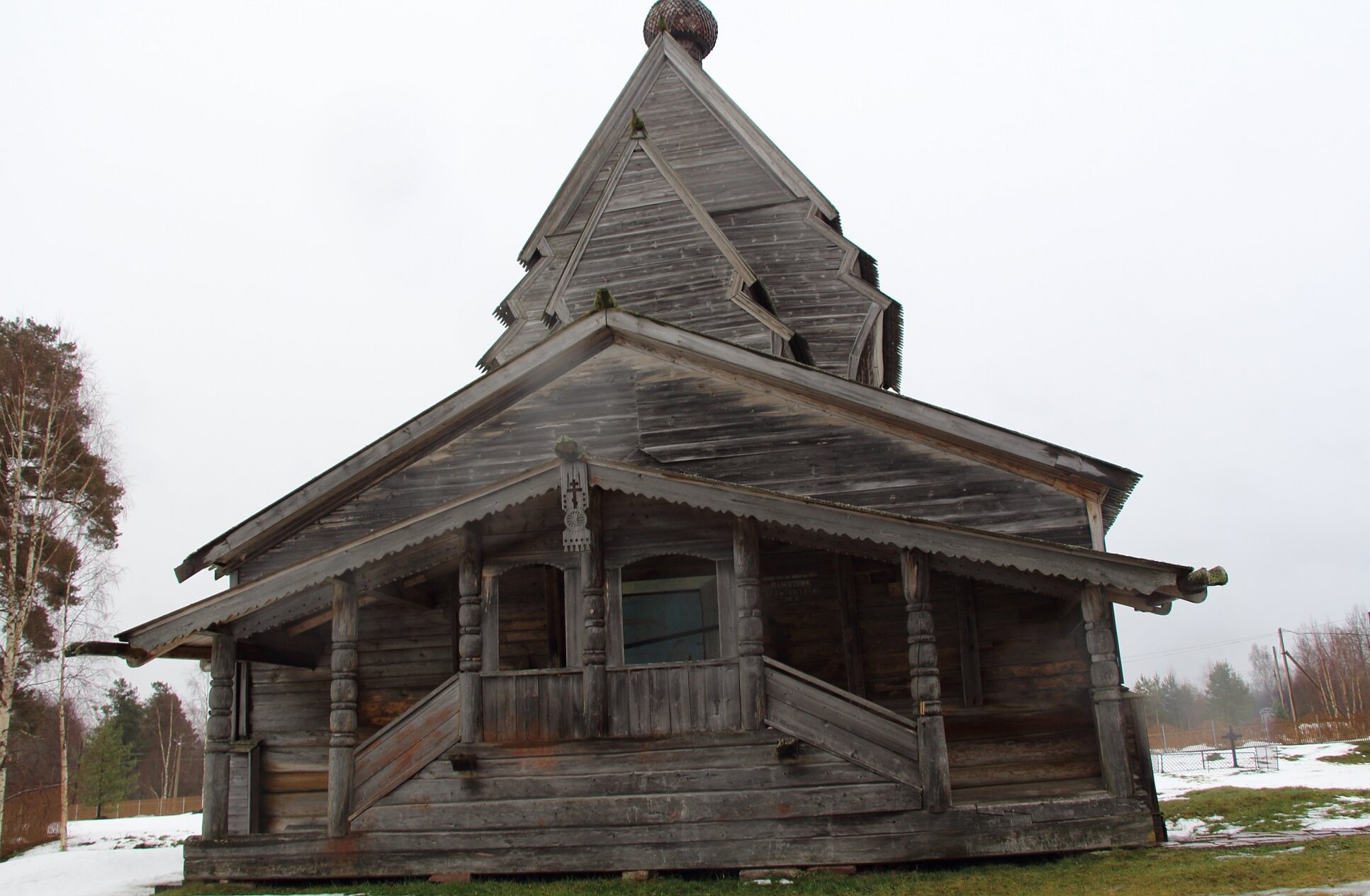 На фотографии запечатлен выдающийся памятник древнерусского деревянного зодчества — Церковь Святого Великомученика Георгия Победоносца, расположенная в деревне Родионово Подпорожского района Ленинградской области. Храм возвышается на живописном берегу реки Свирь, являясь одной из старейших культовых построек русского Севера.
