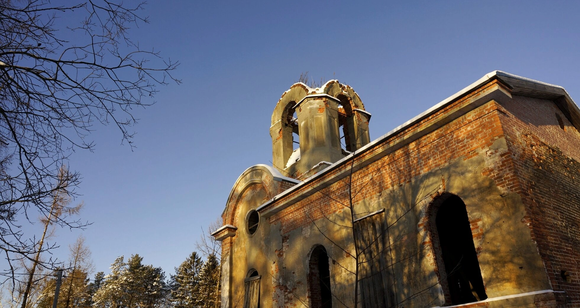 Снимок сделан в зимнее время. Деревья вокруг храма покрыты инеем и снегом, что создаёт атмосферу тишины и вечности. Яркое голубое небо и солнечный свет, падающий на кирпичные стены, контрастируют с суровым состоянием руин, подчёркивая текстуру старой кладки и следы разрушительного действия времени.