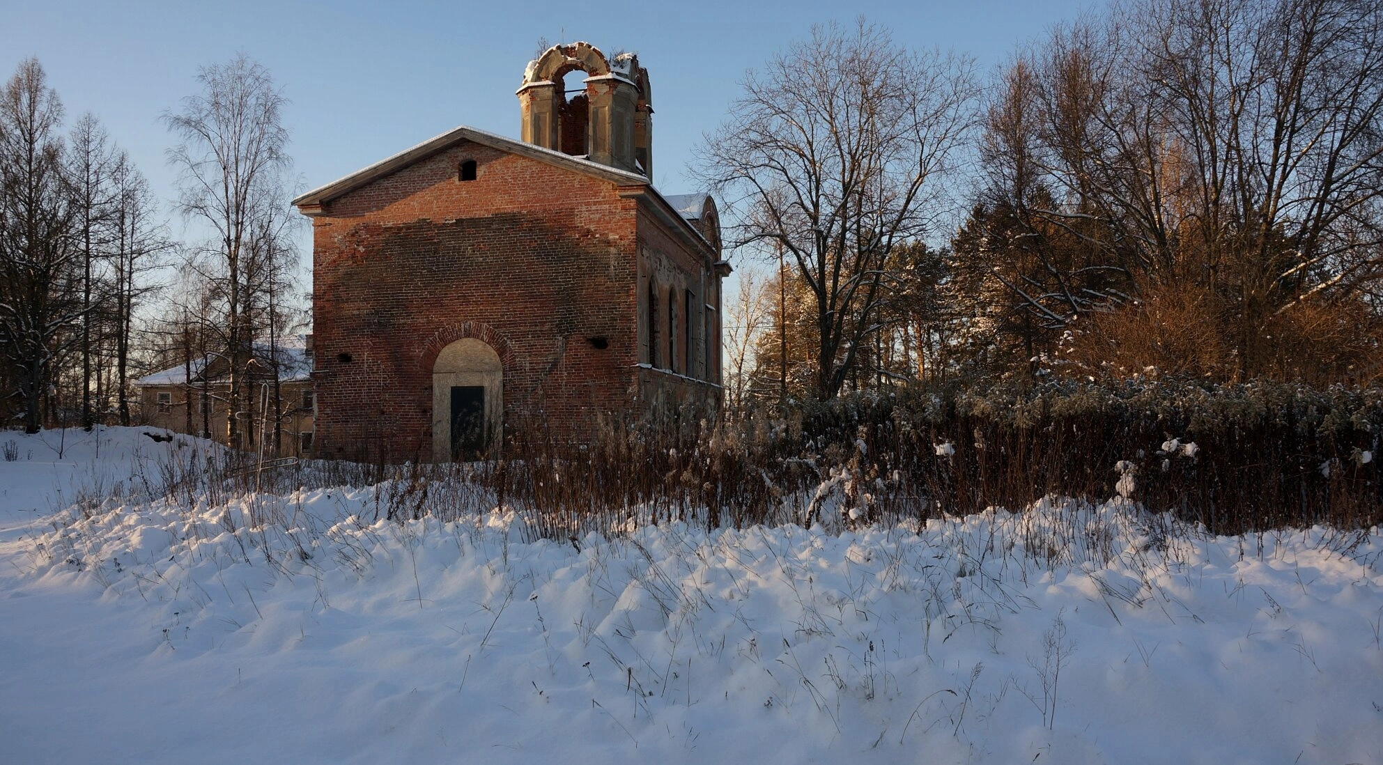 Здание церкви, выстроенное из красного кирпича, является образцом позднего церковного зодчества. Его архитектурный облик, к сожалению, ныне частично утрачен: особенно пострадала колокольня, лишившаяся своего завершения. Снежный покров мягко укутывает руины, придавая месту особую тишину, благоговение и суровую северную красоту. Оголённые ветви деревьев подчёркивают зимнее умиротворение и строгость.