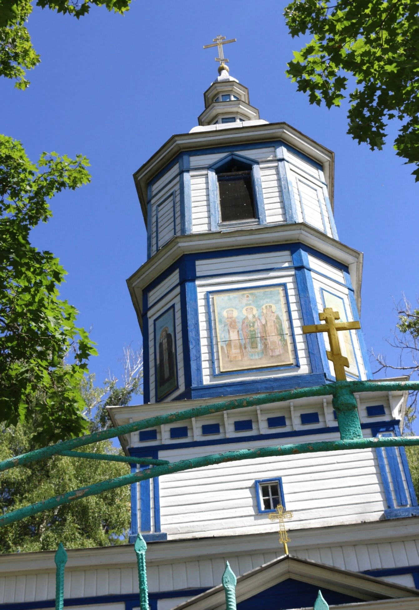 На фасаде храма отчетливо видна икона, написанная непосредственно на дереве или размещенная в киоте, что является характерной деталью убранства православных церквей. Ракурс съемки, выбранный фотографом снизу вверх, усиливает впечатление величия и духовной высоты этого святого места. Церковь в Петъяле является не только архитектурным памятником, но и действующим православным храмом, несущим веру и утешение в этот благодатный край.