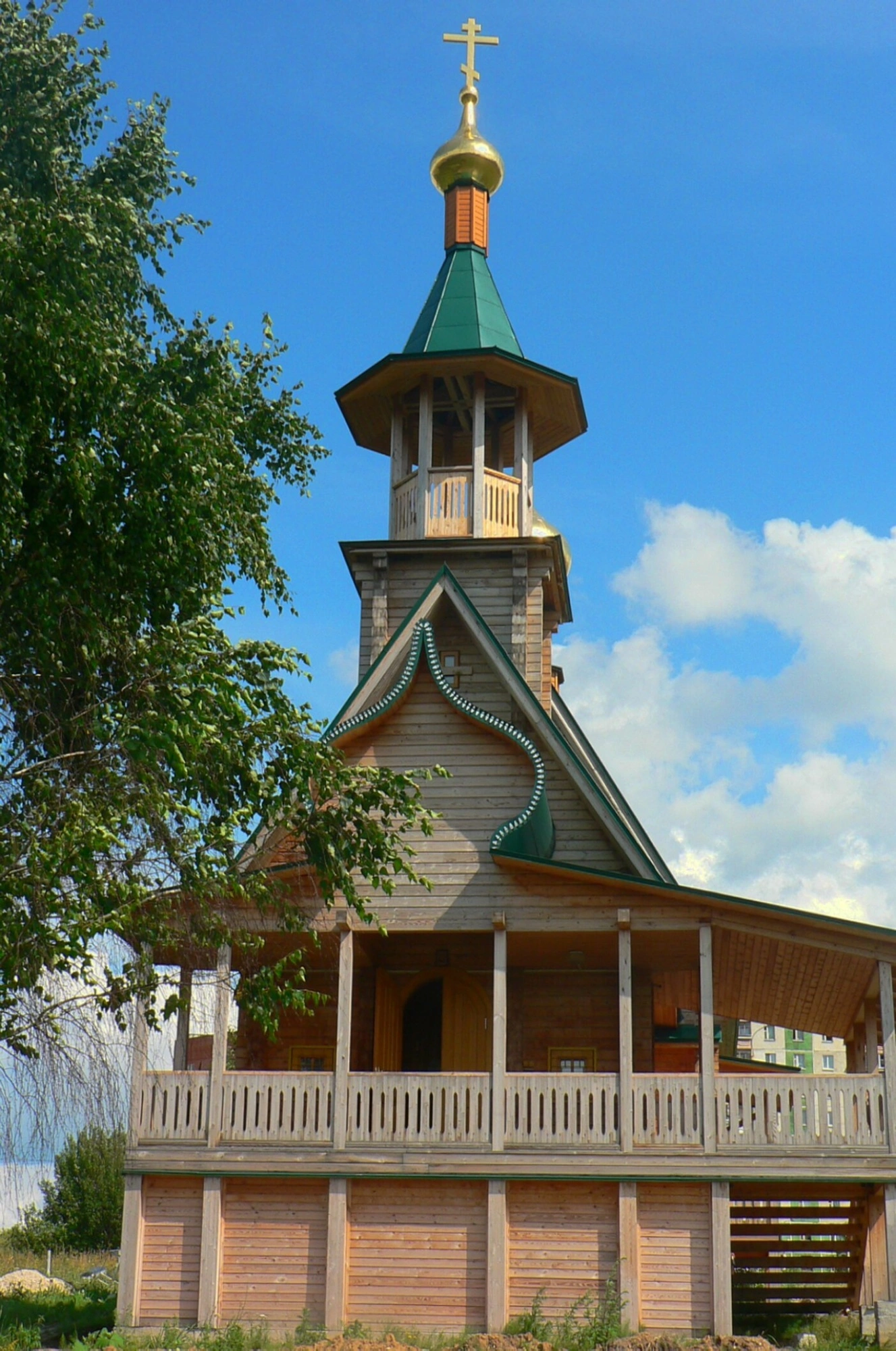 На представленной фотографии запечатлена Церковь во имя святого страстотерпца князя Игоря Черниговского, расположенная в живописном месте Нижнего Новгорода. Этот уникальный православный храм является образцом традиционного русского деревянного зодчества, воплощая в себе многовековые традиции церковного строительства.