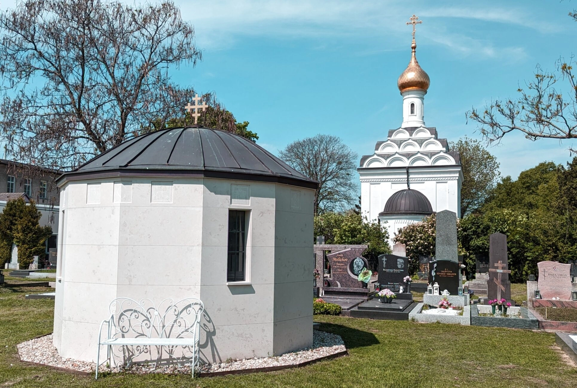 На представленной фотографии запечатлена русская православная церковь во имя Святого и Праведного Лазаря Четверодневного, расположенная на территории Центрального кладбища Вены (Zentralfriedhof). Этот храм является не только архитектурным памятником, но и важным духовным центром для православных верующих австрийской столицы.