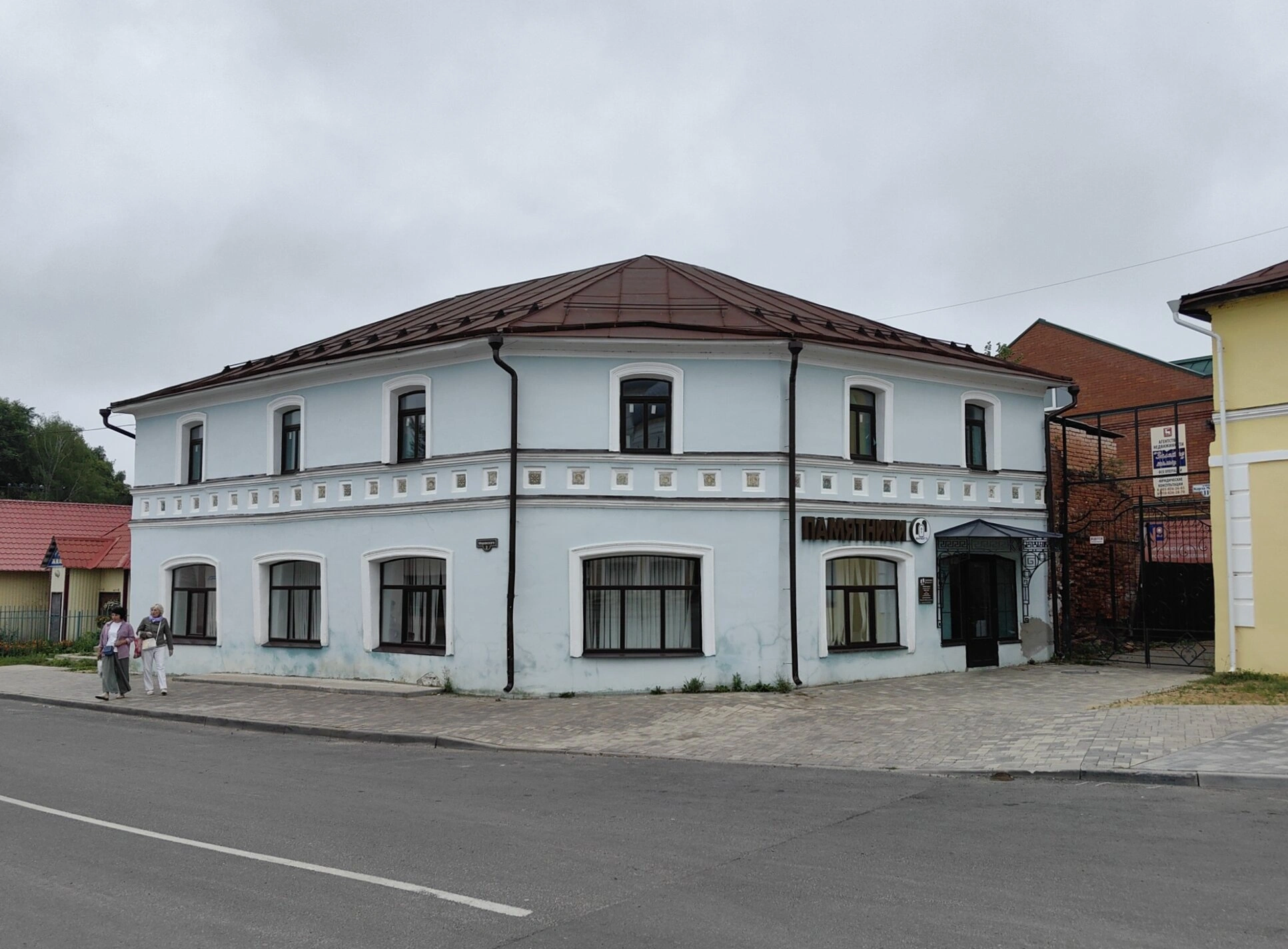 На представленной фотографии запечатлена церковь Святого Леонтия Ростовского Чудотворца, расположенная в исторической части Ростова на Заровье. Святыня представляет собой двухэтажное здание бледно-голубого цвета, возведённое на углу улицы. Храм венчает коричневая крыша сложной формы, характерная для традиционной православной архитектуры.