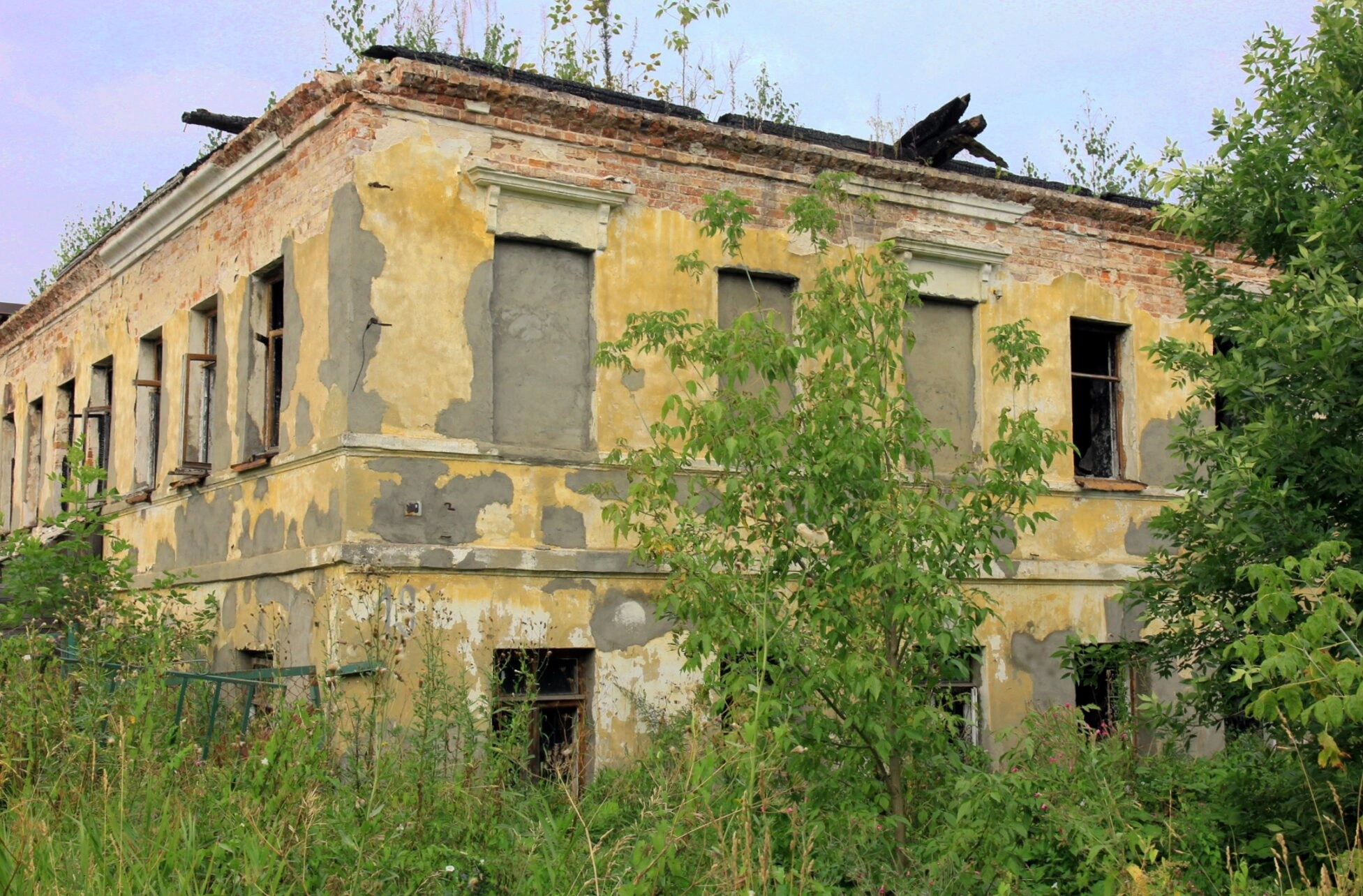 Территория вокруг храма заросла высокой травой и кустарником, что подчёркивает заброшенность этого некогда духовного центра. При внимательном рассмотрении можно различить сохранившиеся архитектурные элементы: наличники над окнами второго яруса, характерные для храмового зодчества позапрошлого века, а также следы былого благолепия в оформлении фасадов.