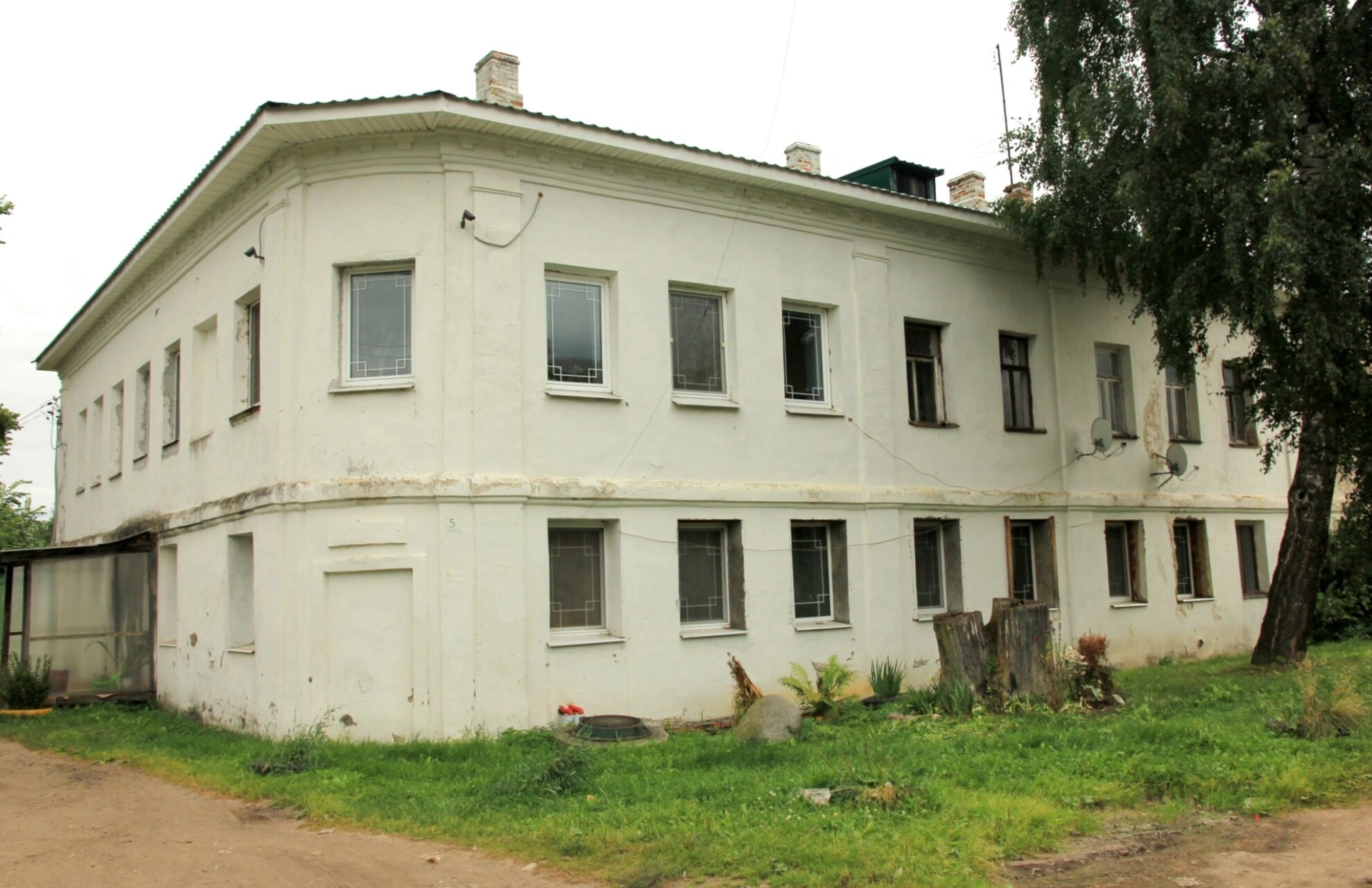 Окружает святыню живописный природный ландшафт: ухоженная травянистая растительность, на переднем плане справа виднеются пни и дерево с густой раскидистой кроной. Перед храмом проходит грунтовая дорога, а небо в момент съёмки было покрыто облаками, создавая особую атмосферу духовного умиротворения.