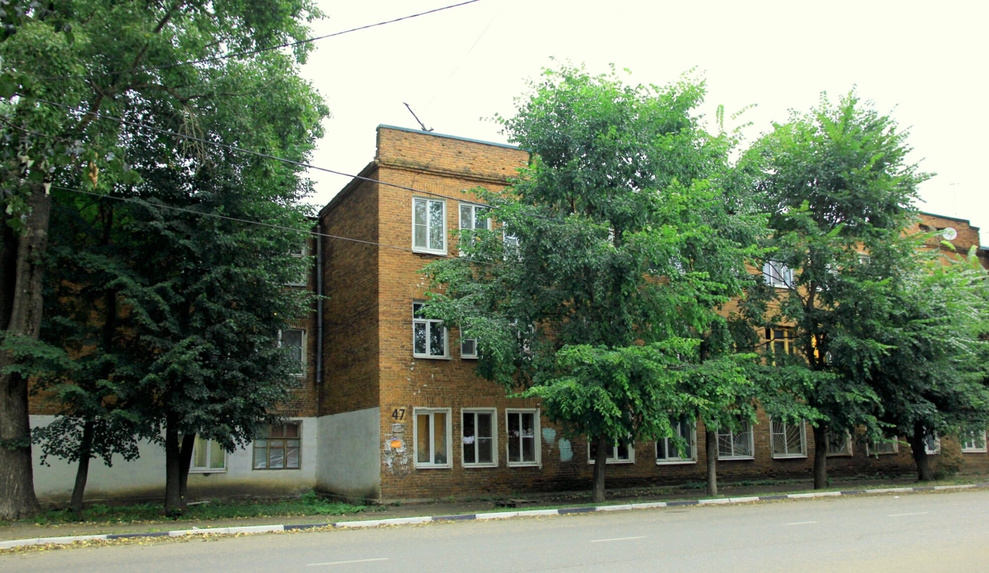 Перед храмом проходит асфальтированная дорога, а по бокам и перед фасадом возвышаются высокие деревья, создающие естественное обрамление для церковного здания. На фасаде видны следы исторических надписей и объявлений, напоминающие о многовековой истории этого святого места.