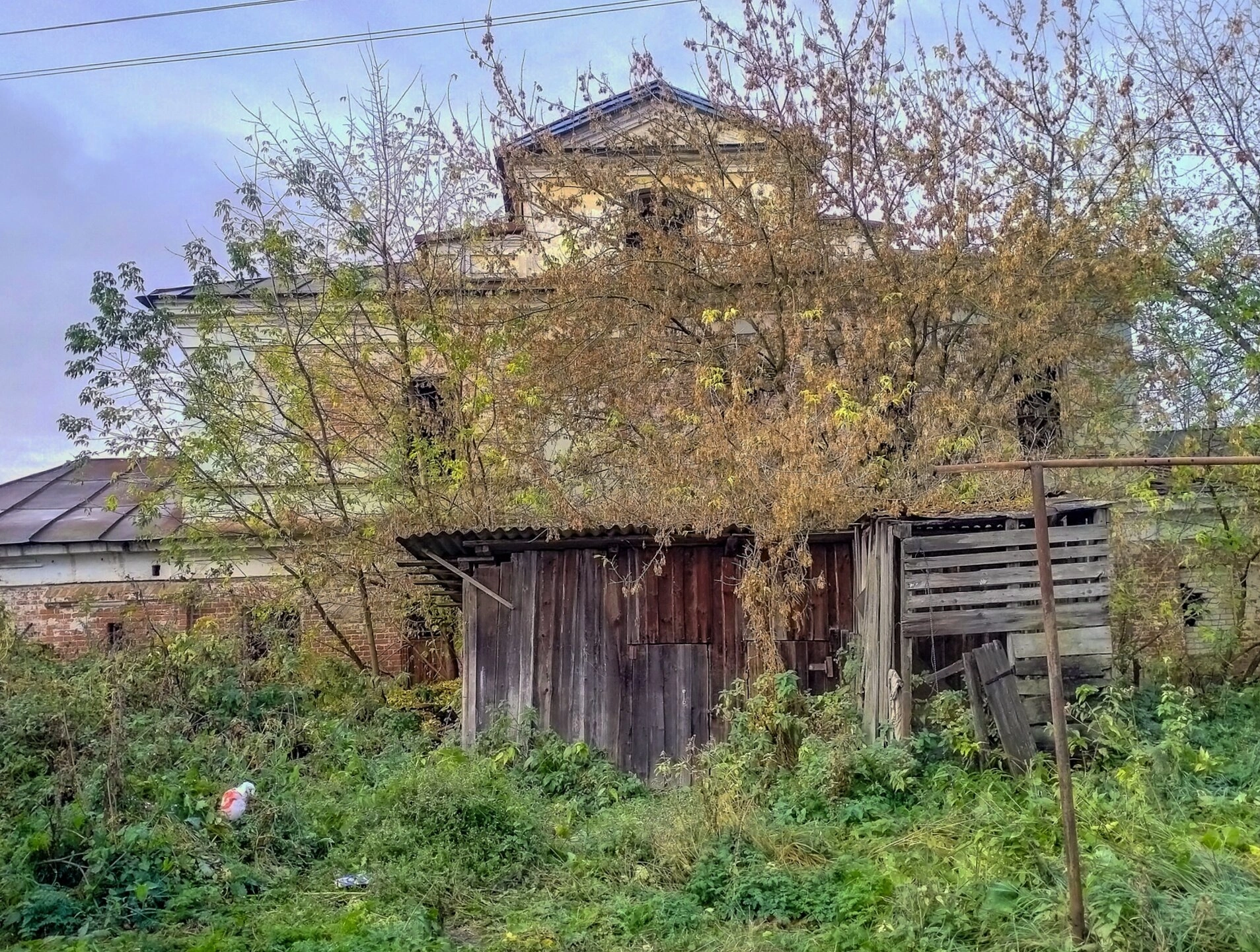 По сторонам от основного здания просматриваются более поздние деревянные пристройки, находящиеся в крайне ветхом состоянии. Всю территорию вокруг храма заполонила густая растительность: деревья и кустарники вплотную подступают к стенам, а у основания наблюдается обильный рост сорных трав. Такое запустение святого места вызывает глубокую скорбь у верующих и ценителей православного наследия.