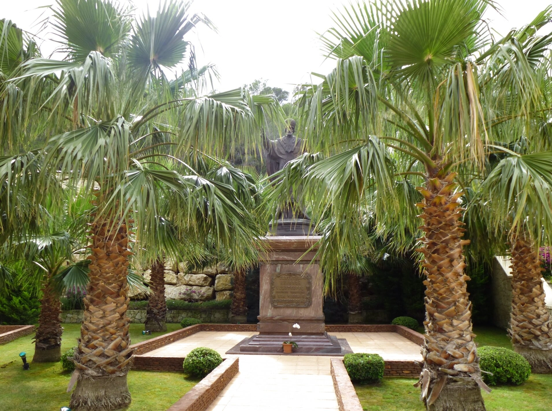Территория перед храмом украшена ухоженными лужайками, аккуратно подстриженными кустарниками и мощёными дорожками, ведущими к святыне. Архитектурный ансамбль гармонично вписан в природный ландшафт, что создаёт атмосферу благоговения и покоя. Высокие пальмы вида вашингтония нитеносная (Washingtonia filifera), типичные для средиземноморского климата, обрамляют вид, подчёркивая величие храма.