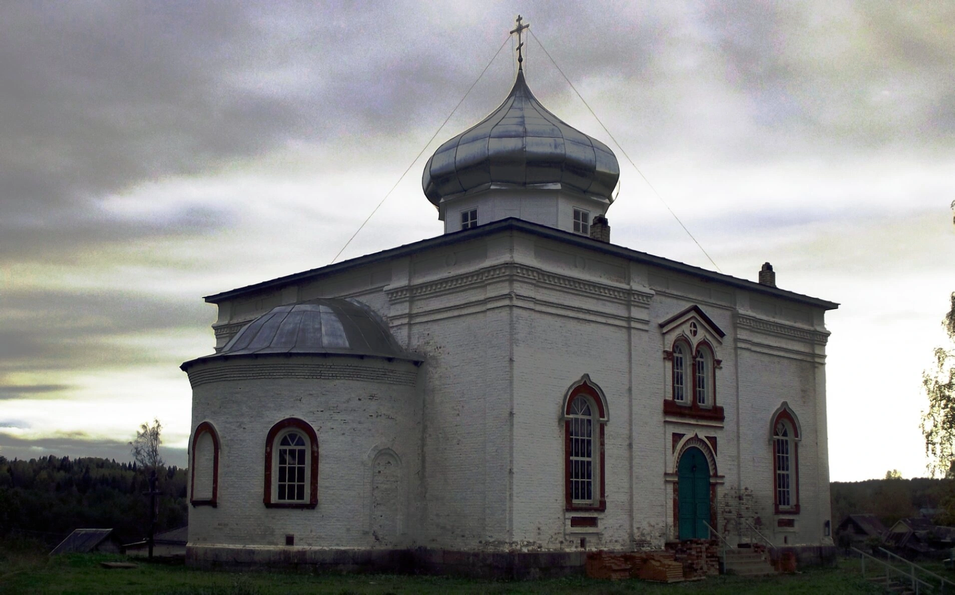 С левой стороны к основному объёму храма примыкает низшая пристройка, увенчанная полукруглой главой, что является характерным элементом церковной архитектуры данного региона. Святыня живописно расположена в сельской местности, окружена зелёным травяным покровом, а на заднем плане виднеется густой лесной массив, создающий ощущение уединённости и покоя.