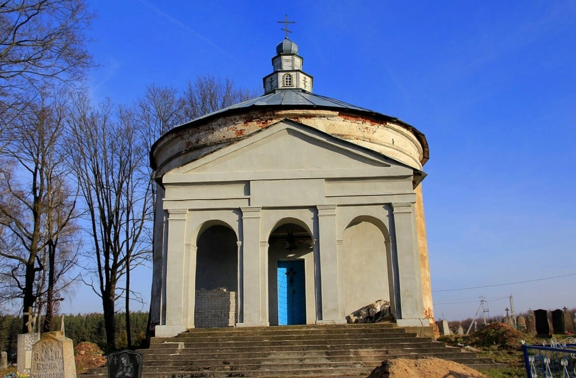 На представленной фотографии запечатлён уникальный памятник православного зодчества — Церковь Святого Николая Чудотворца, расположенная в деревне Пральники Кореличского района Гродненской области. Храм был возведён в 1805 году из кирпича и является ярким примером архитектуры классицизма, выполненным в редкой для белорусских земель форме ротонды.