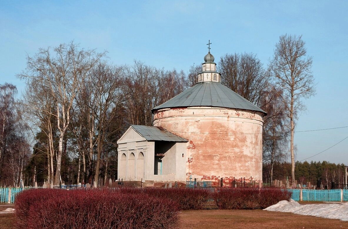 На представленной фотографии запечатлена Церковь Святого Николая Чудотворца, расположенная в деревне Пральники Минской области Беларуси. Этот уникальный православный храм, возведённый в 1863 году из бутового камня и кирпича, является ярким образцом архитектуры периода эклектики. Его центральный объём решён в редкой для белорусского зодчества форме ротонды, что придаёт святыне особую монументальность и величие.