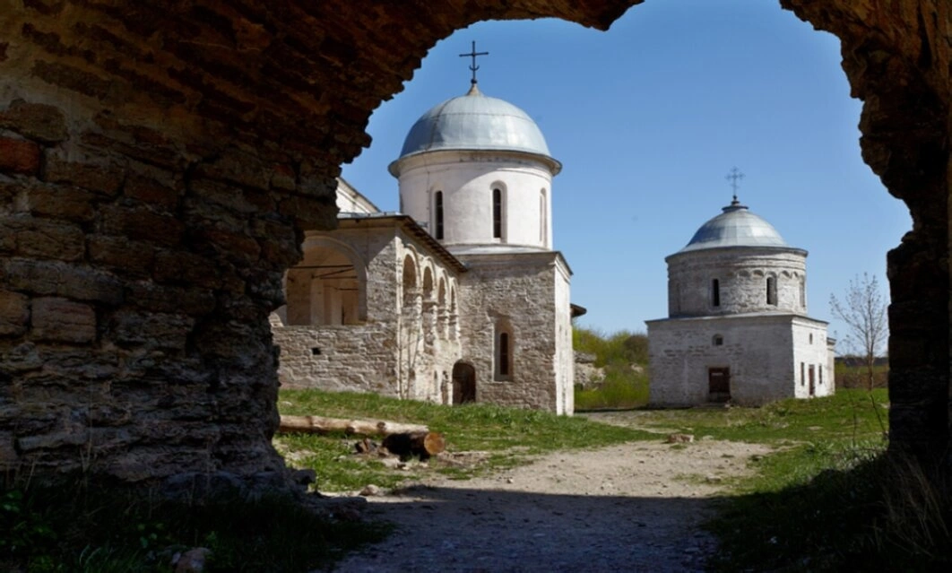 Чистое голубое небо на заднем плане, простирающееся над твердыней, символизирует небесное покровительство сей древней православной цитадели. На территории виднеются участки зелёной травы, грунтовые тропы и остатки деревьев, что подчёркивает историческую подлинность и особую атмосферу этого намоленного места, веками хранившего западные рубежи Святой Руси.