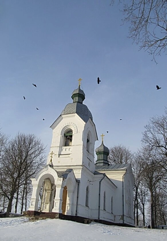 Белоснежные стены храма символизируют духовную чистоту и благодать, а ярко-зелёные купола, увенчанные сияющими на солнце золотыми крестами, устремляются к ясному голубому небу, где парят птицы. В зимнем убранстве церковь выглядит особенно торжественно и одухотворённо, контрастируя с окружающим покровом снега и силуэтами голых деревьев.