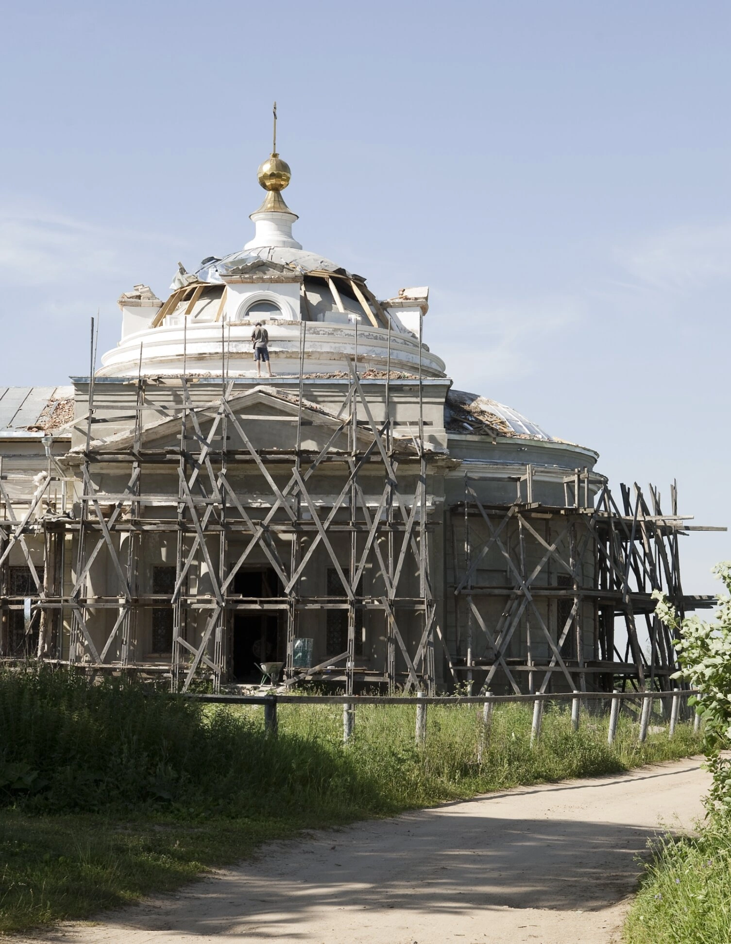 На представленной фотографии запечатлён храм во имя Святителя Николая Чудотворца, расположенный в селе Озерцое Сергиево-Посадского района Московской области. Снимок сделан в период проведения масштабных реставрационных работ, о чём свидетельствуют установленные по всему периметру здания деревянные строительные леса.