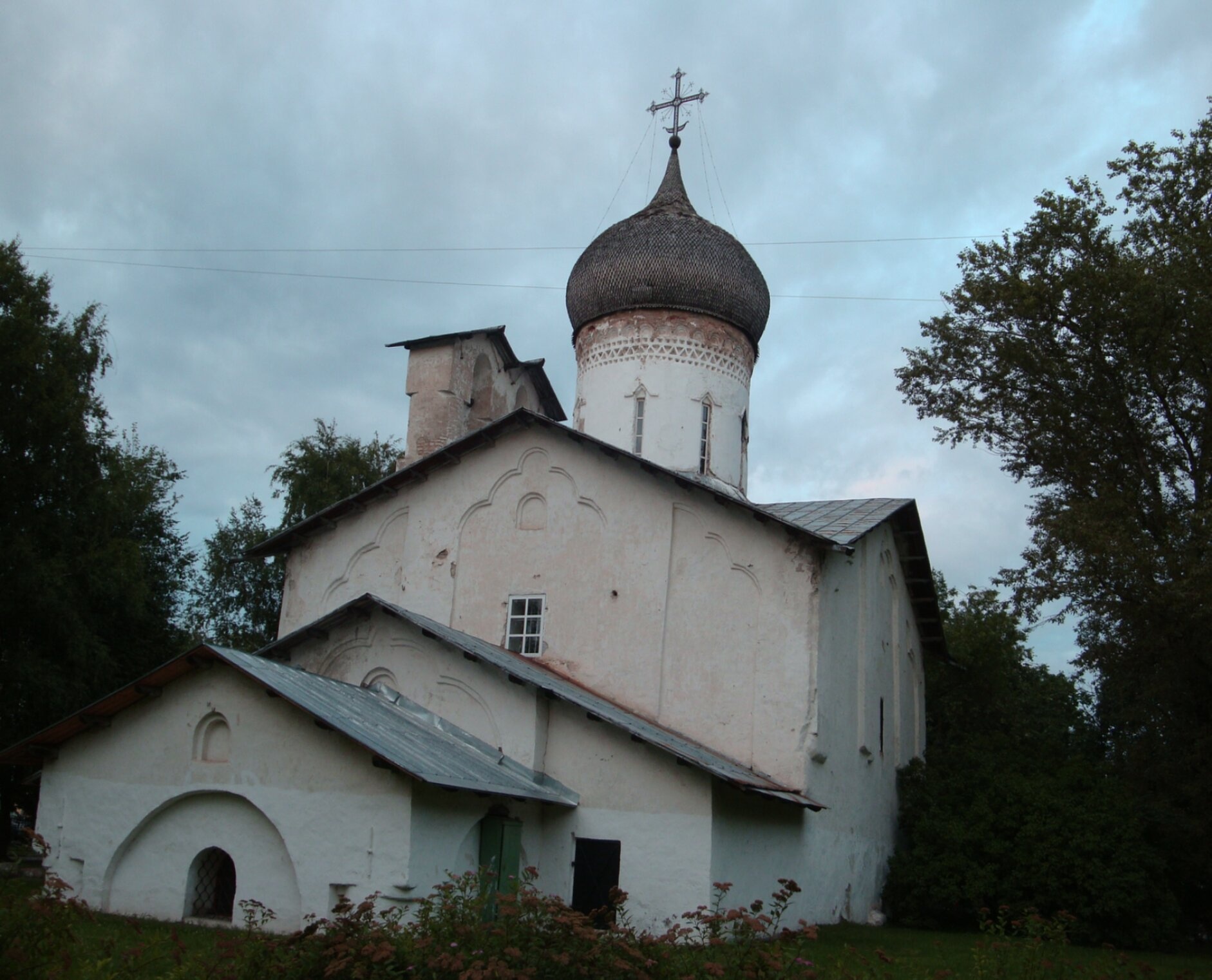 Храм увенчан традиционным луковичным куполом, который венчает святой крест, сияющий под небом Псковщины. Небольшие оконные проёмы, характерные для псковского стиля, свидетельствуют о суровом северном климате и оборонительном значении храмов в прошлом. На переднем плане фотографии хорошо различим вход в церковь с арочным завершением и скромной пристройкой, что добавляет комплексу ощущение древности и основательности.