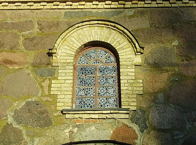 Центральным элементом композиции является арочное окно, обрамленное аккуратной кирпичной кладкой. Окно украшено витражным узором, который в солнечные дни наполняет внутреннее пространство храма разноцветным освещением, создавая особую молитвенную атмосферу. Арочная форма оконного проема характерна для православной церковной архитектуры и символизирует устремленность верующих к горним высотам.