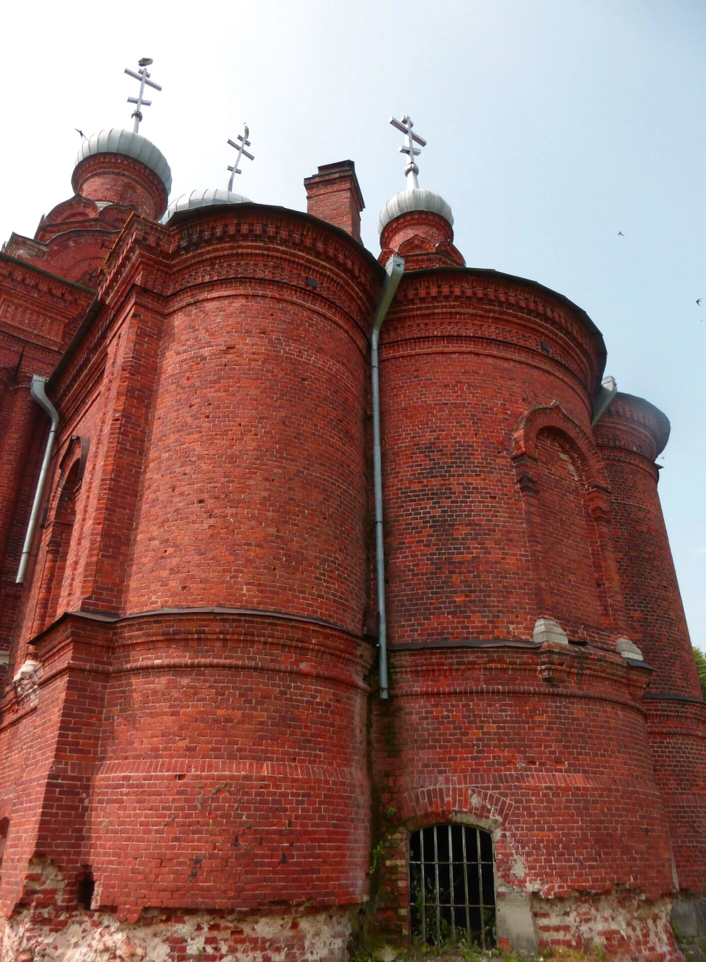 Фотография позволяет оценить монументальность строения и его гармоничные пропорции. Несмотря на видимые следы времени, выражающиеся в некоторой обветшалости кирпичной кладки, храм сохраняет своё духовное величие и архитектурную целостность. Снимок сделан в ясный солнечный день, что подчёркивает красоту памятника на фоне голубого неба и окружающей его природной зелени.