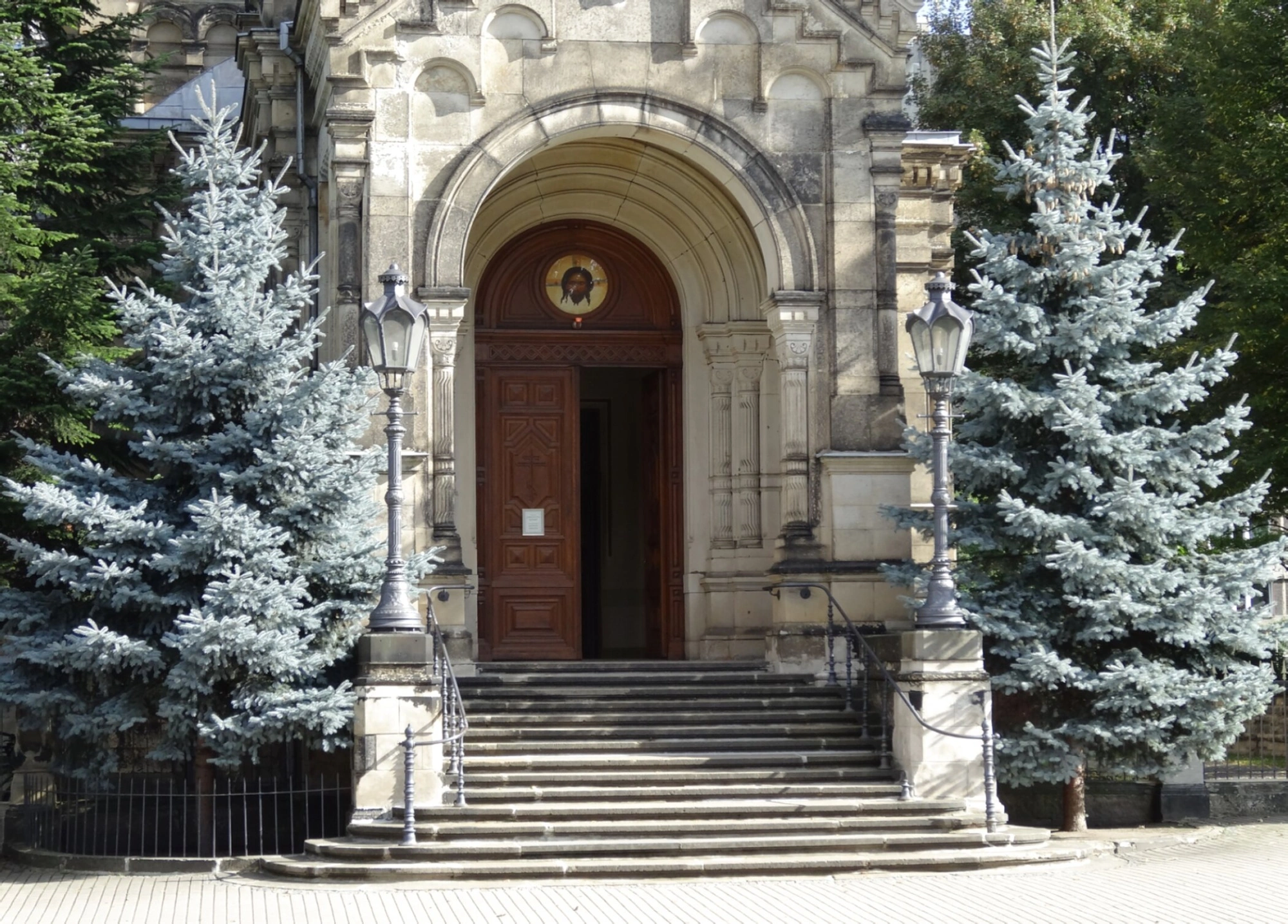 На фотографии запечатлён главный вход в храм Святого праведного Симеона Дивногорца, являющийся православной святыней в сердце Дрездена. Это каменное здание, возведённое в неорусском стиле, представляет собой выдающийся образец церковной архитектуры начала XX века.