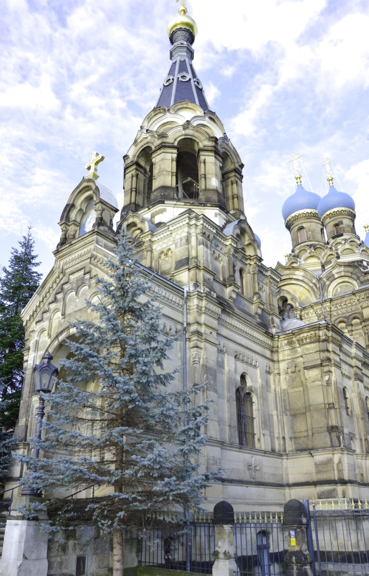 На фотографии запечатлён величественный православный храм во имя преподобного Симеона Дивногорца, находящийся в саксонском городе Дрездене. Святыня, освящённая в честь святого подвижника VI века, является не только духовным центром для православных верующих, но и выдающимся памятником русской церковной архитектуры начала XX столетия.