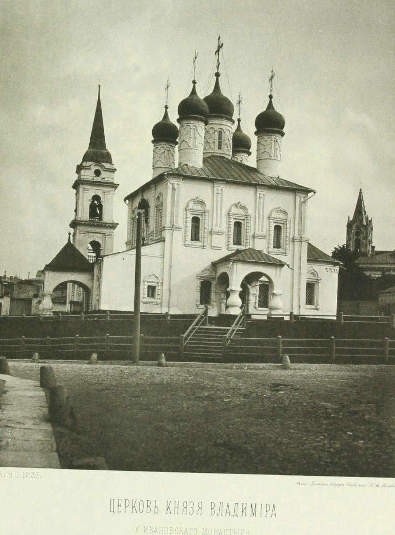 На представленной исторической фотографии запечатлен архитектурный ансамбль Церкви во имя святого равноапостольного князя Владимира, что в Старых Садах. Храм расположен в Басманном районе Москвы, в непосредственной близости от Ивановского монастыря. Снимок выполнен в черно-белой гамме и передает благолепие православной святыни, возведенной в XVI столетии.