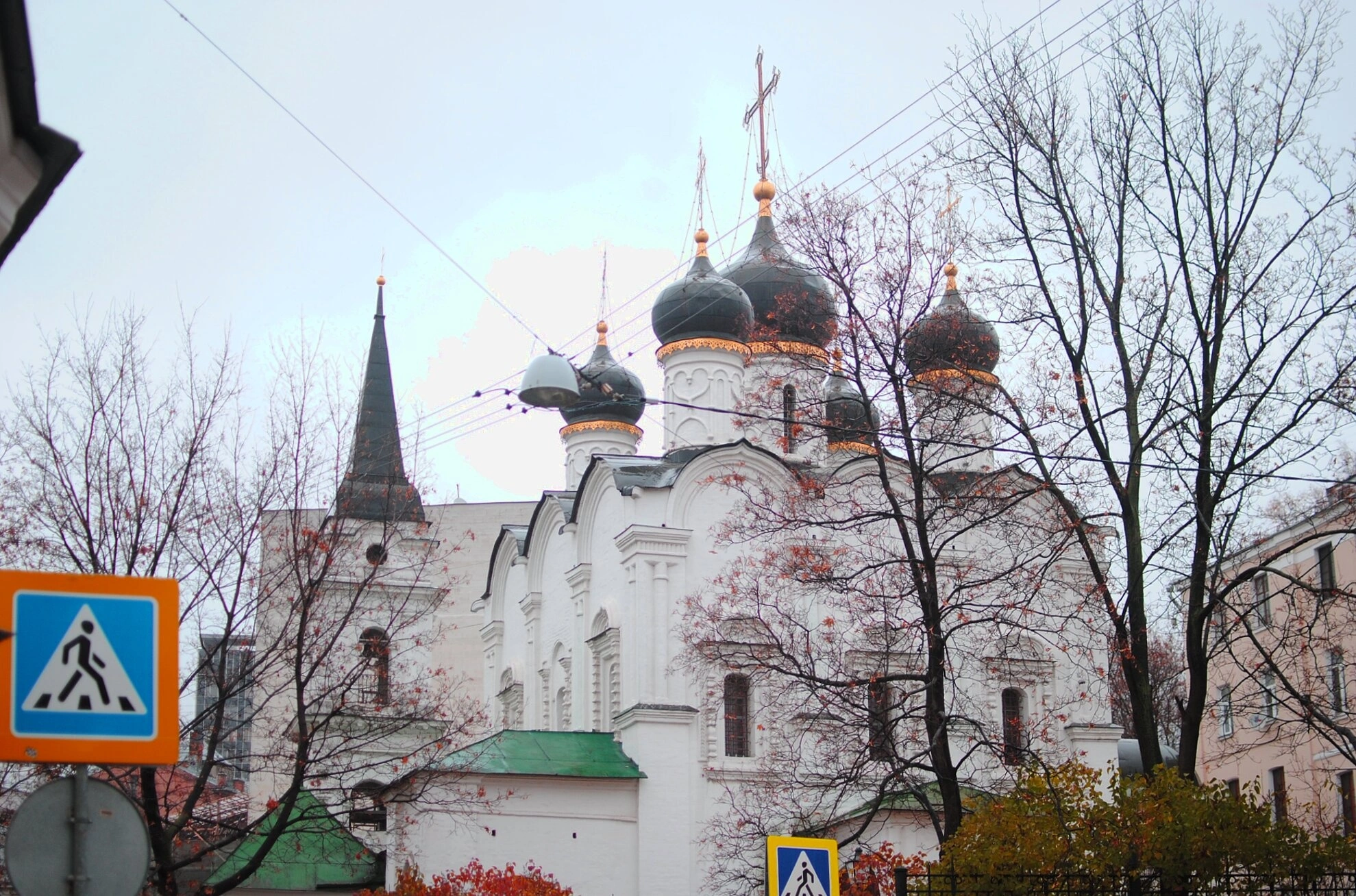 Снимок сделан в осенний период, когда окружающие храм деревья уже практически полностью сбросили листву. Пасмурная погода создает особую атмосферу умиротворения и спокойствия, что подчеркивает благодатную силу святого места. На переднем плане фотографии видны элементы городской инфраструктуры, включая дорожные знаки, что свидетельствует о расположении храма в городской среде.