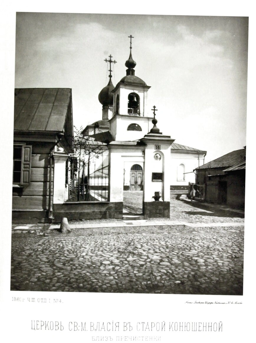 На исторической фотографии 1881 года, выполненной в рамках проекта Н.А. Найдёнова по документальной фиксации московских святынь, запечатлён храм священномученика Власия, епископа Севастийского, что в Старой Конюшенной слободе. Этот уникальный православный храм, расположенный в Гагаринском переулке на пересечении с Большим Власьевским переулком, является единственным в Москве, освящённым во имя этого святого, особо почитаемого на Руси как покровителя домашнего скота и животных.