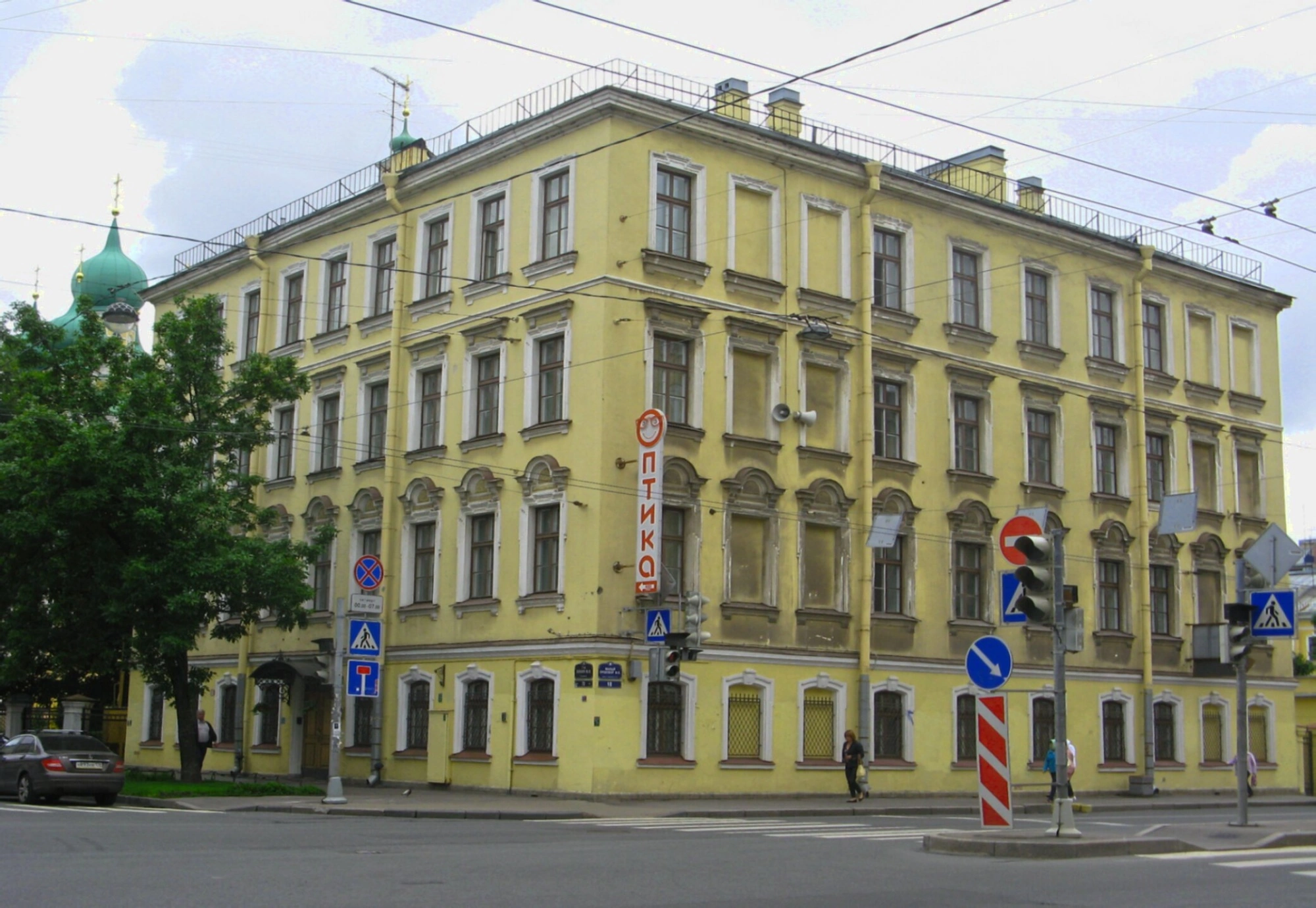 В левой части снимка, возвышаясь над кронами деревьев, видны два благолепных зеленых купола храма, увенчанные златоглавыми крестами, сияющими в небесной вышине. Основной план фотографии занимает угловое желтое здание, расположенное напротив церковной ограды, на котором различима вывеска «ОПТИКА».