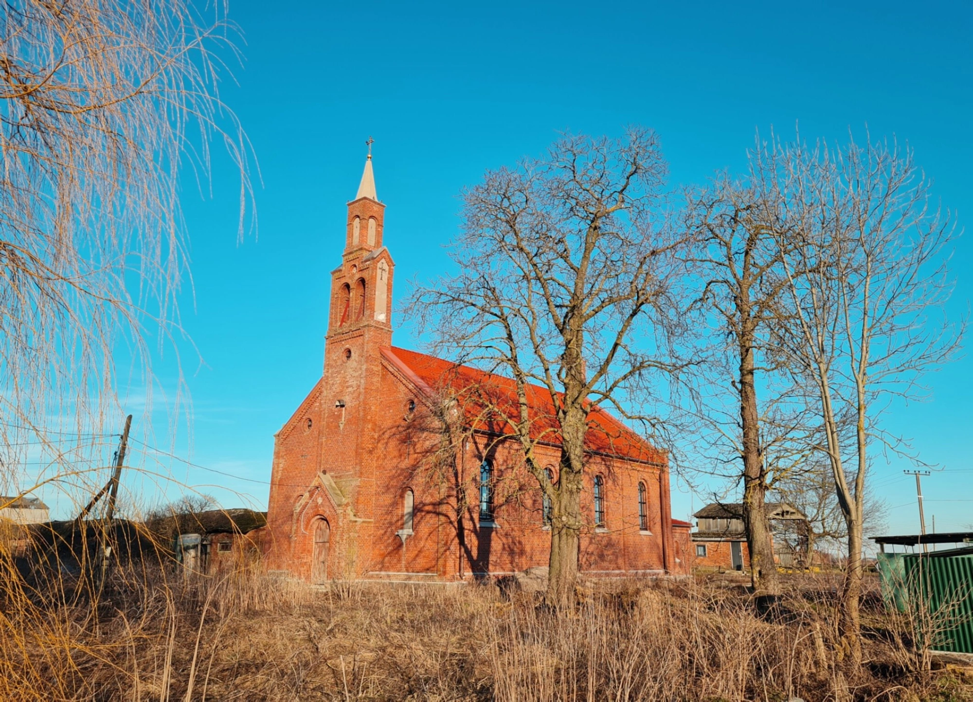 Снимок сделан в безлиственный период, вероятно, ранней весной или поздней осенью. Вокруг храма видны деревья с голыми ветвями, на переднем плане — сухая жёлтая трава и кустарники. На фоне просматриваются другие строения и линии электропередачи, напоминая о том, что святыня существует в современном мире.