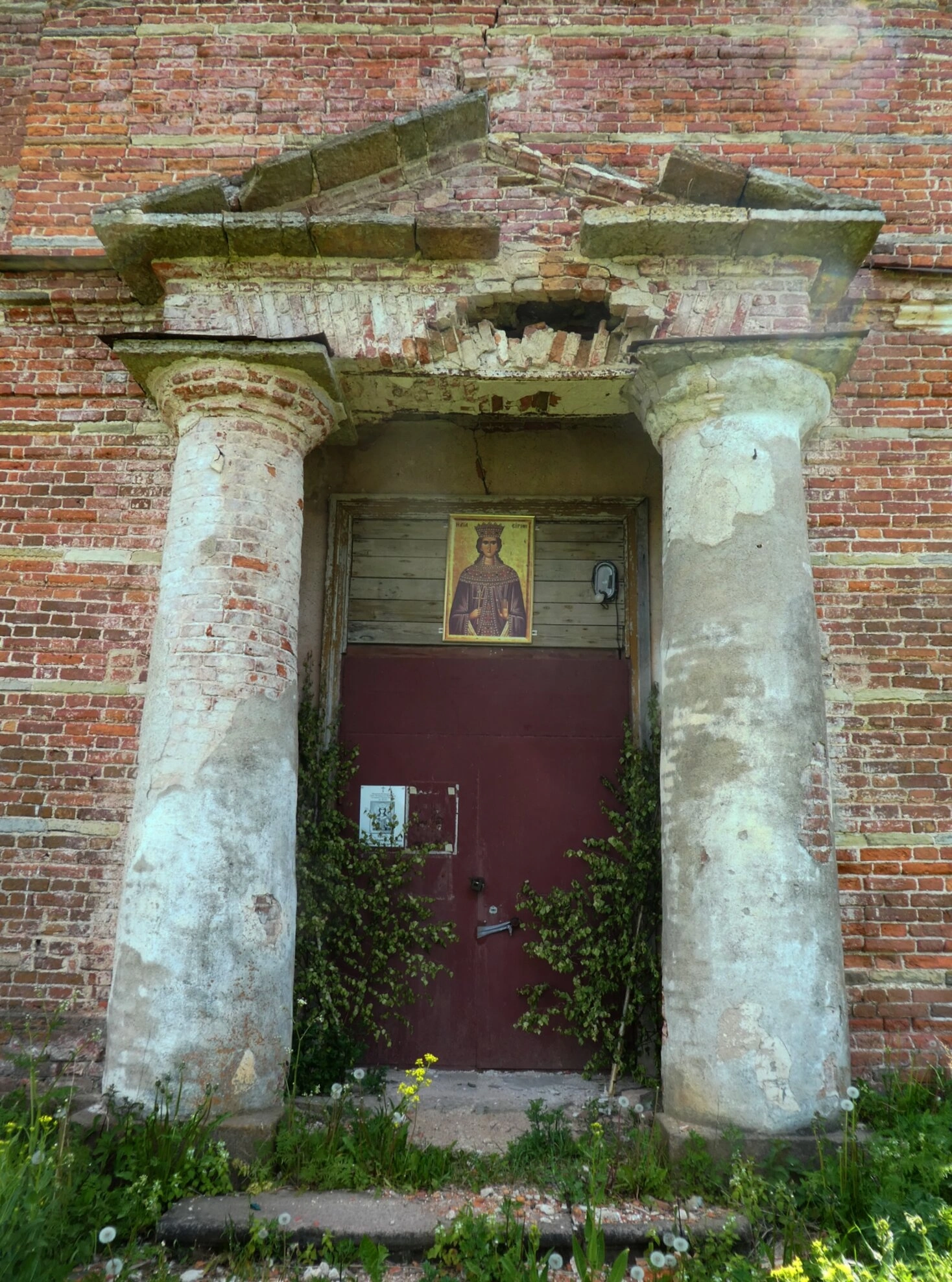На фотографии запечатлён исторический вход в храм святой великомученицы Ирины, расположенный в деревне Волгово Ленинградской области. Святыня представляет собой образец православной архитектуры, выполненный из кирпича с характерными элементами храмового зодчества.