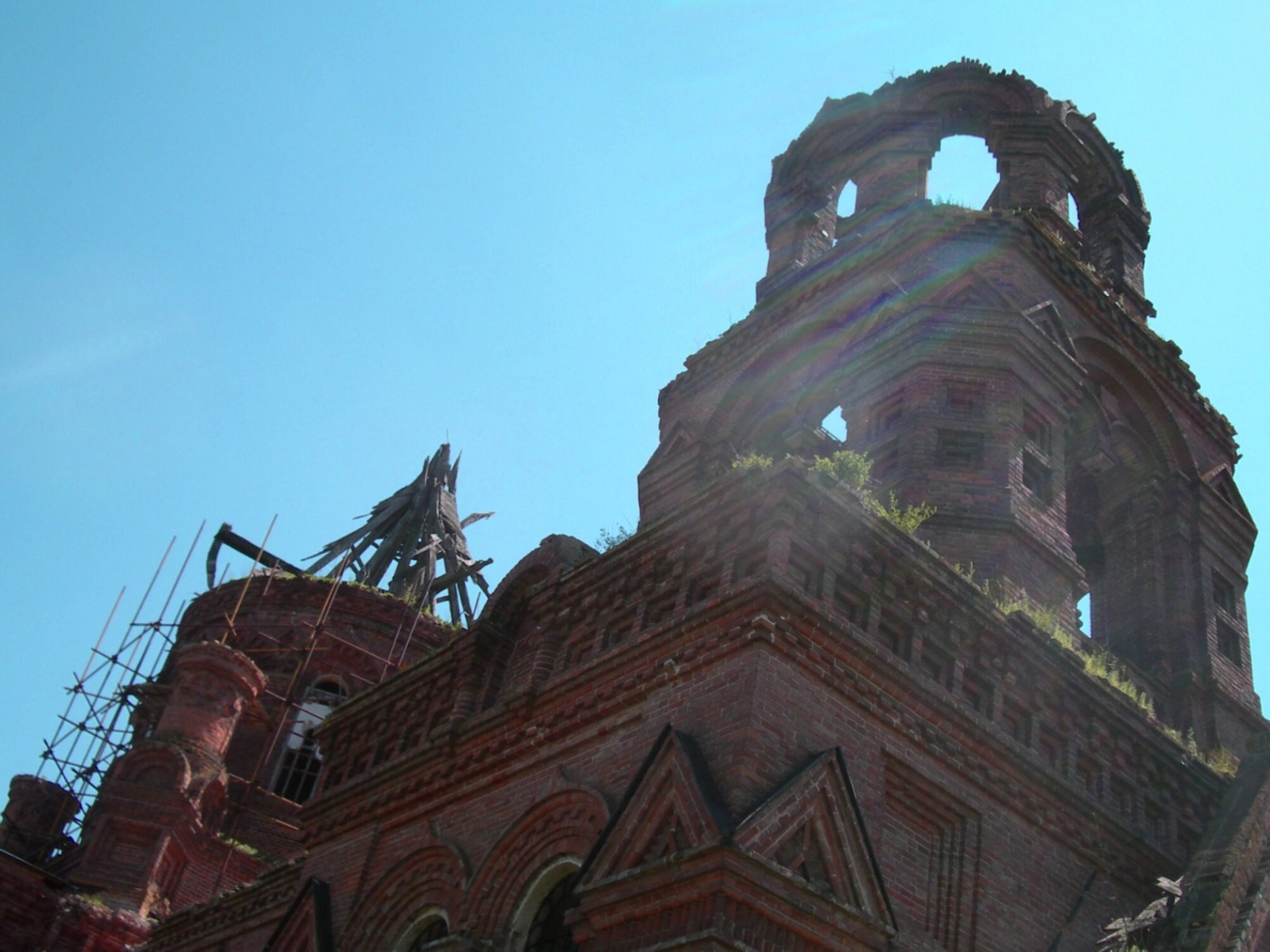На фотографии запечатлена колокольня храма святой Параскевы Пятницы, расположенного в селе Погорельцево Брянской области. Координаты 52.14095100; 35.31681500 точно указывают на это сакральное место, исторически значимое для православного мира. Архитектурный облик колокольни, выполненной из кирпича, демонстрирует характерные черты церковного зодчества конца XIX — начала XX века. Несмотря на частичное разрушение, сооружение сохраняет величие и духовную силу, присущую православным святыням.