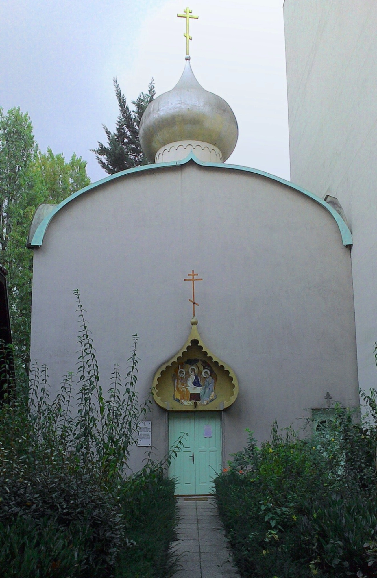 Справа к храму примыкает глухая белая стена соседнего здания, слева видны деревья с зелёной листвой, что создаёт камерную и умиротворённую атмосферу. Фотография передаёт скромную, но благоговейную архитектуру храма, напоминающую о духовной крепости русской православной общины во Франции.