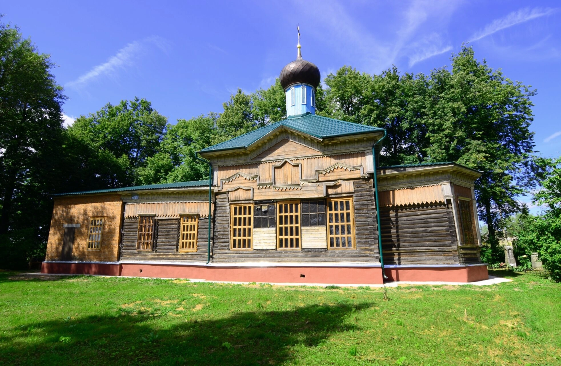 На представленной фотографии запечатлена Церковь Святой Троицы, расположенная в деревне Горетово Можайского городского округа Московской области. Этот деревянный православный храм является памятником культурного наследия и образцом традиционного церковного зодчества.