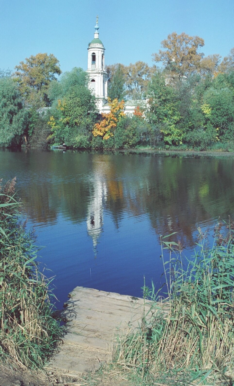 Архитектурный ансамбль храма гармонично вписан в природный ландшафт. Осенняя листва окружающих деревьев создает прекрасное цветовое обрамление - оттенки от зеленого до золотисто-желтого и огненно-оранжевого подчеркивают благородную белизну церковных стен. На переднем плане виден деревянный мостик, ведущий к водной глади, по краям которого растут камыши и прибрежная растительность.