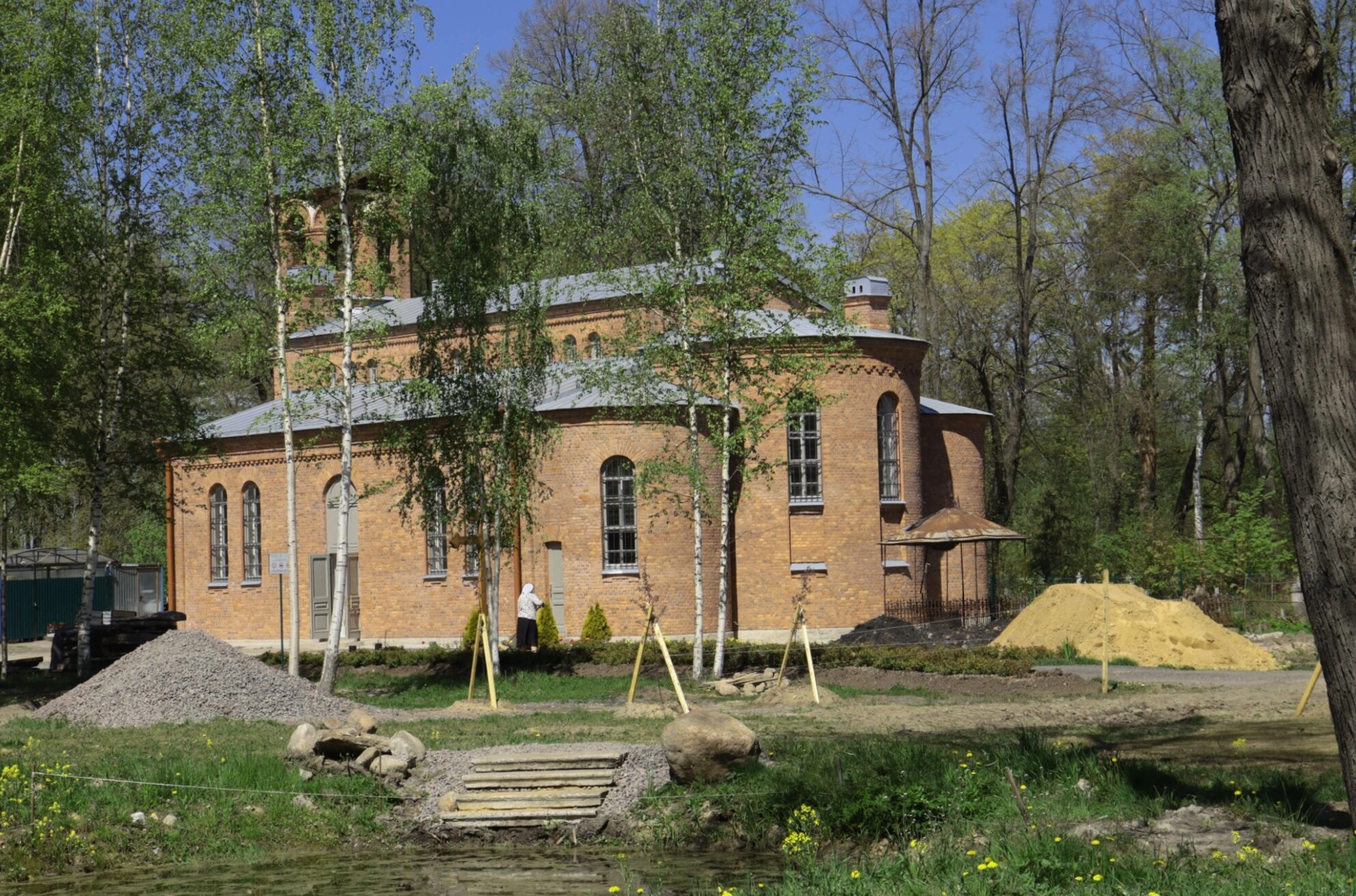 На снимке хорошо просматривается состояние храма на момент съёмки: церковь окружена зелёными насаждениями, а на переднем плане видны признаки проведения благоустроительных работ, что свидетельствует о заботе прихода о территории. Фасад здания сохраняет свои исторические черты, включая арочные оконные проёмы и кирпичный декор.