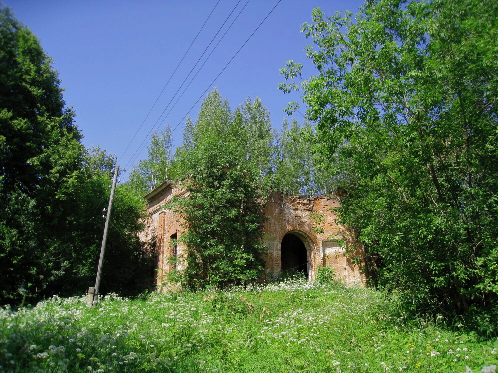 На представленной фотографии запечатлена Церковь Святой Троицы, расположенная в селе Новощапово Клинского района Московской области. Храм находится в severely разрушенном состоянии, что свидетельствует о длительном периоде забвения и отсутствия реставрационных работ. Кирпичные стены храма частично обрушились, а сохранившиеся фрагменты демонстрируют следы многолетнего воздействия природных стихий.