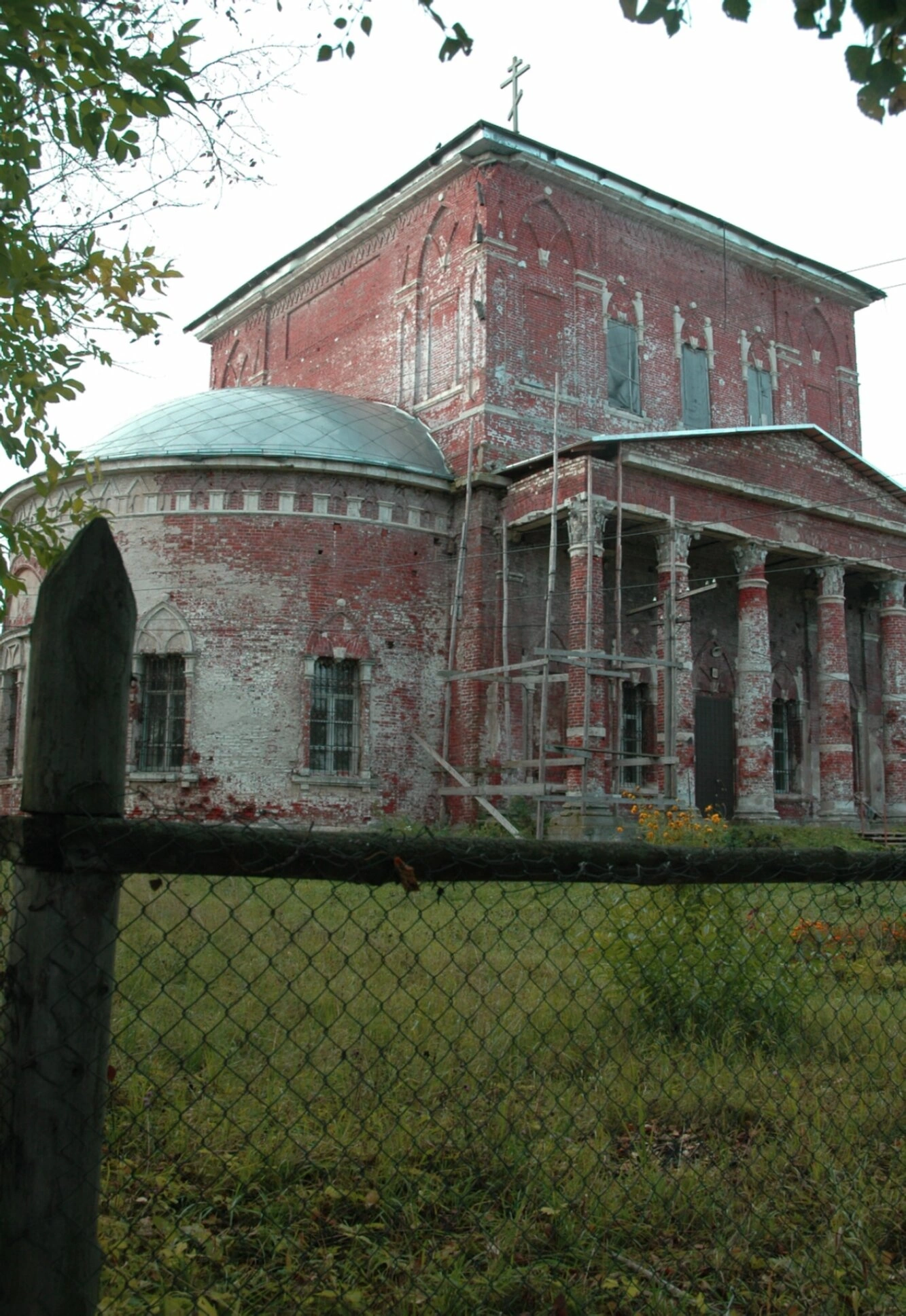 Храмовая постройка возведена из красного кирпича и отличается строгими пропорциями, характерными для русского классицизма. Фасад здания украшает монументальный портик с колоннами, придающий сооружению особую величавость и торжественность. Подобная архитектурная композиция была распространена в церковном зодчестве периода позднего классицизма и отражает стремление к гармонии и симметрии.