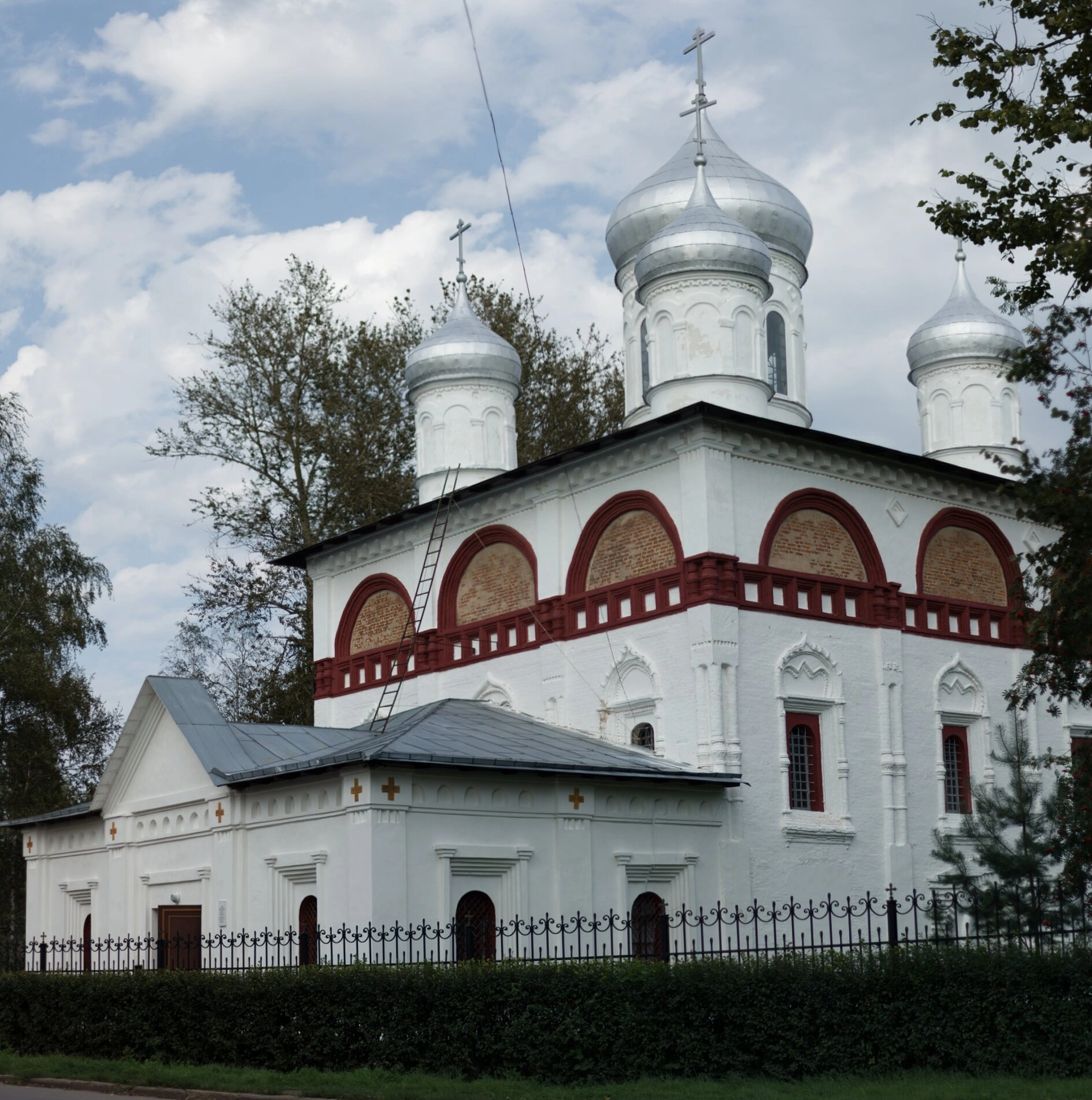 Фасад храма украшен изящным аркатурным поясом с алыми вставками, что придаёт ему нарядный и праздничный вид. Оконные проёмы обрамлены яркими красными наличниками, характерными для традиционного русского церковного зодчества. Территория вокруг храма утопает в зелени деревьев и кустарников, а от проезжей части её отделяет аккуратный низкий забор, выполненный из кованого металла.