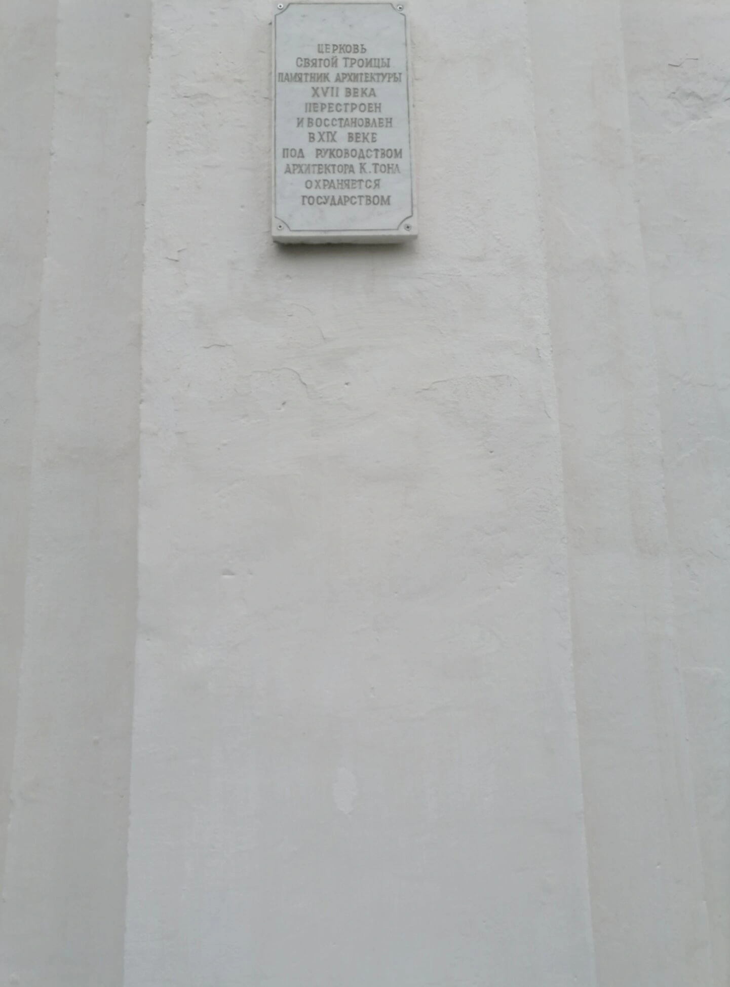 На фотографии запечатлена стена Церкви Святой Троицы, что в древнем городе Старая Русса Новгородской области. В верхней части кадра расположена мемориальная доска, свидетельствующая о статусе этого храма как памятника архитектуры XVII века. Текст на доске гласит: «ЦЕРКОВЬ СВЯТОЙ ТРОИЦЫ ПАМЯТНИК АРХИТЕКТУРЫ XVII ВЕКА ПЕРЕСТРОЕН И ВОССТАНОВЛЕН В XIX ВЕКЕ ПОД РУКОВОДСТВОМ АРХИТЕКТОРА К.ТОНА ОХРАНЯЕТСЯ ГОСУДАРСТВОМ».