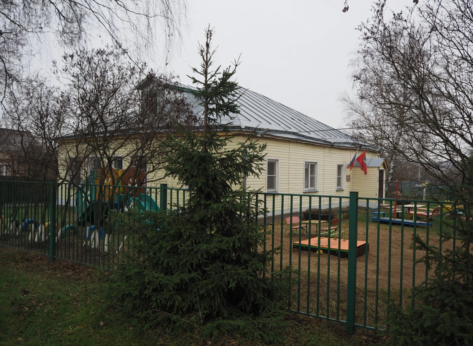 На представленной фотографии запечатлена Церковь Святой Троицы, расположенная в деревне Троице-Сельцы Мытищинского района Московской области. Свято-Троицкий храм представляет собой одноэтажное здание светлого желтого цвета, увенчанное серой металлической кровлей. На фасаде здания, справа от оконного проема, размещен государственный флаг Российской Федерации, что подчеркивает особый статус православного храма как культурного и духовного наследия страны.