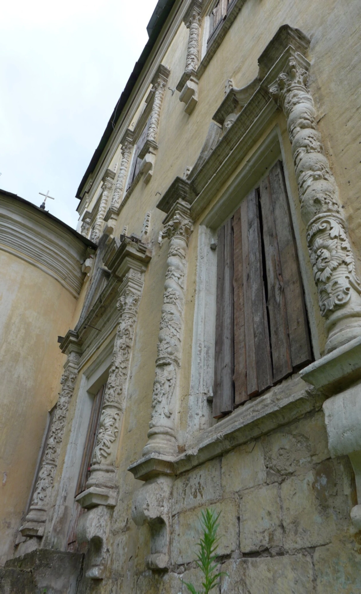На представленной фотографии запечатлён фасад старинного православного храма — Церкви Святой Живоначальной Троицы, что на берегу Волги в городе Твери. Здание, выполненное из светлого камня и оштукатуренное, демонстрирует благородную ветхость, свидетельствующую о его долгой истории. Многочисленные оконные проёмы на фасаде заботливо заколочены деревянными щитами для сохранения целостности сооружения.